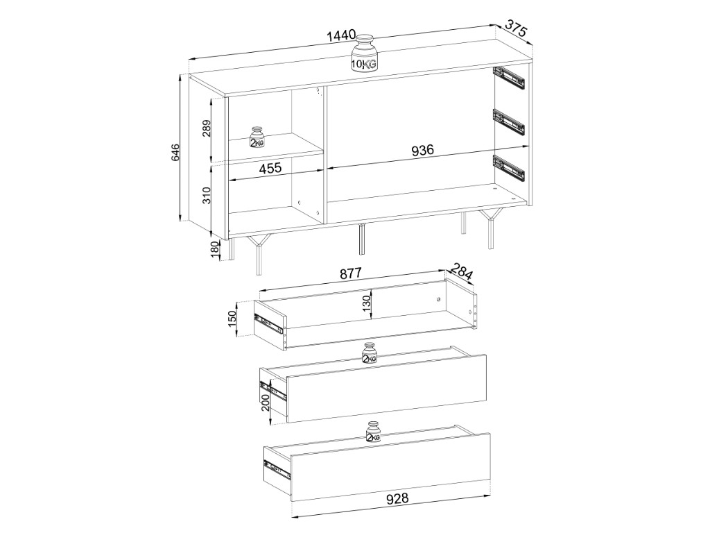 Komoda Raven nemá úchytky, na otvorenie dvierok vám poslúži systém Push to Open. Priestranná komoda poskytne dostatok priestoru na uloženie všetkého, čo potrebujete. Disponuje 3 širokými zásuvkami a policami. Celkový vzhľad vnesie do interiéru luxusný nádych.