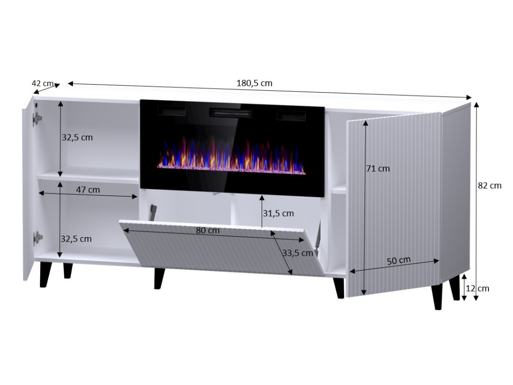 Súčasťou komody je integrovaný elektrický LED krb, ktorý vytvára príjemnú a útulnú atmosféru bez potreby komína či zložitej inštalácie. Pod krbom sa nachádzajú praktické vyklápacie dvierka, ktoré poskytujú úložný priestor doplnený o dve uzatvorené skrinky po stranách. Komoda Pafos spája dizajn, funkčnosť a moderný komfort do jedného harmonického celku a stáva sa prirodzeným stredobodom obývačky.