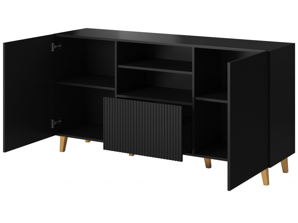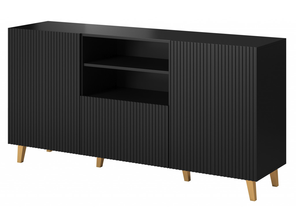 Komoda Pafos je elegantný kus nábytku v modernom alebo škandinávskom štýle. Zariadeniu obývacej izby dodá estetický nádych a zároveň ponúka funkčný úložný priestor. Pozornosť pútajú najmä frézované čelá v podobe vertikálnych línií, ktoré ešte viac zdôrazňujú geometrický tvar komody osadenej na štýlových zlatých nožičkách. Komoda je vybavená dvoma skrinkami, zásuvkou a otvorenými policami