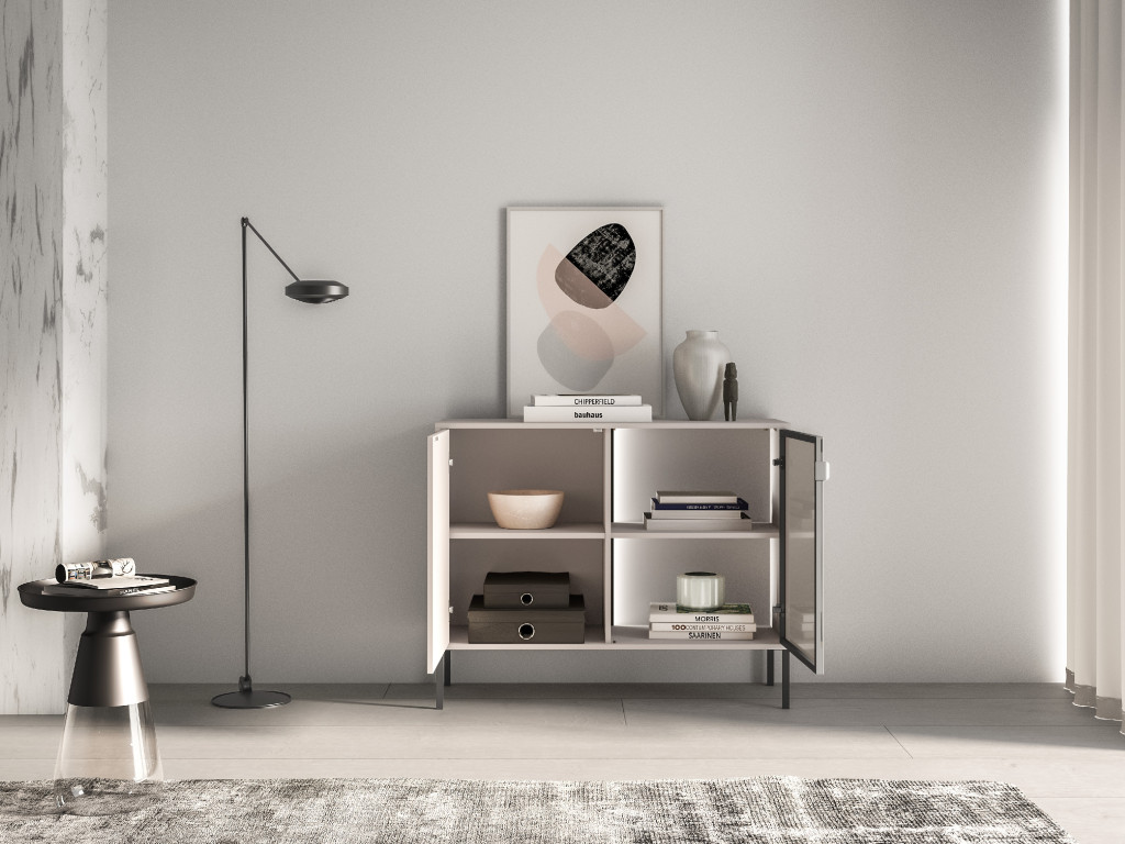 Charakteristickým prvkom kolekcie sú dvierka z tvrdeného grafitového skla v hliníkovom ráme, ktoré pôsobia luxusne a zároveň ľahko. Teplé biele LED osvetlenie s nastaviteľnou intenzitou jemne presvitá cez dymové sklo a vytvára príjemnú, atmosférickú náladu v interiéri.
