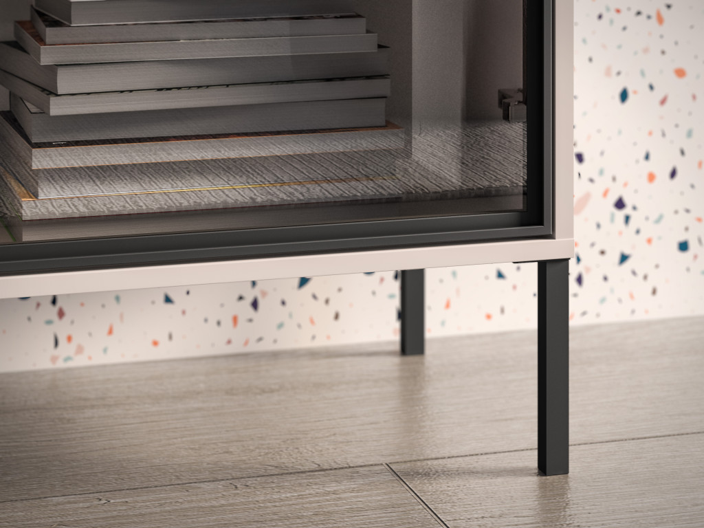 Čierny kovový rám a vysoké kovové nohy dodávajú nábytku moderný industriálny akcent a zároveň uľahčujú upratovanie. Guľôčkové pojazdy zabezpečujú plynulý chod zásuviek a ich úplný výsuv, čo zvyšuje komfort každodenného používania.