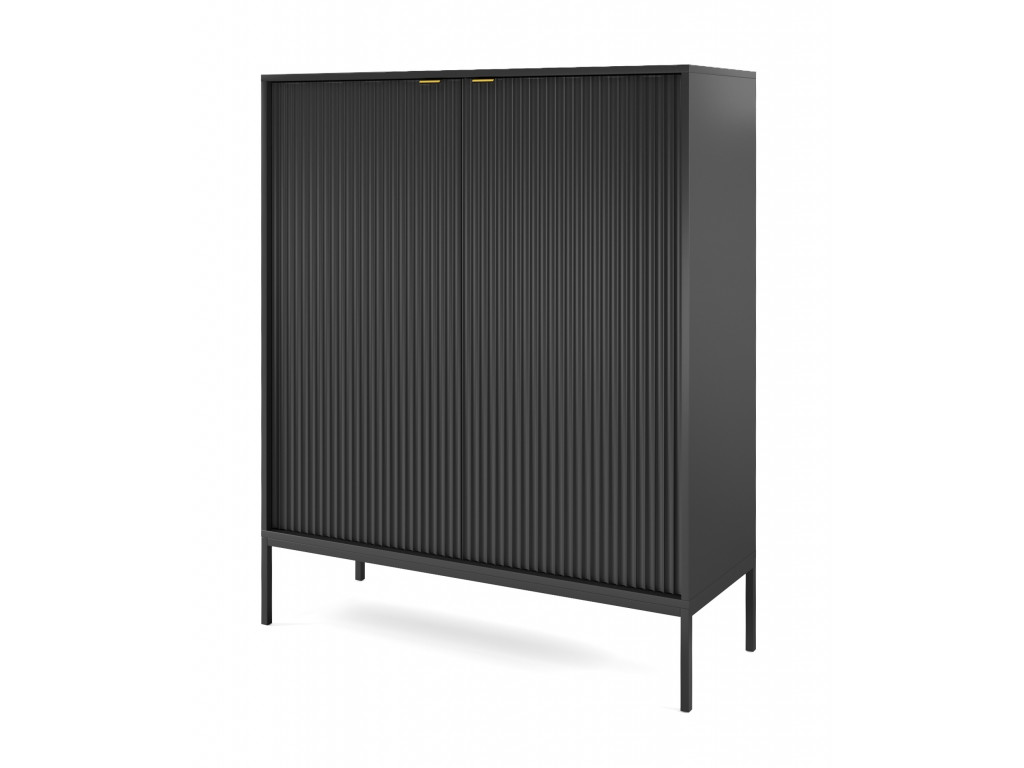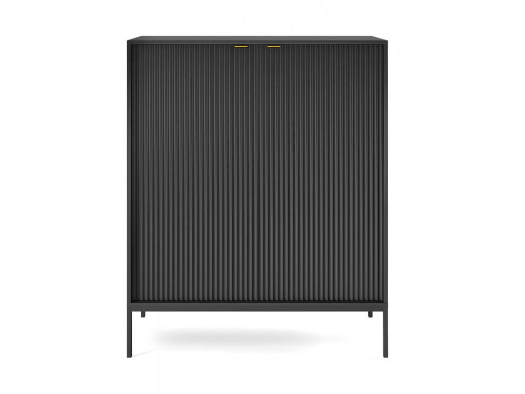 Komoda Novas v modernom dizajne vnesie do interiéru luxusný nádych. Je vyrobená z kvalitných materiálov odolných voči poškodeniu. ABS hrany ju robia odolnou voči poškodeniu. Predné drážkované časti sú doplnené o úchytky v zlatej farbe z hliníka. Komoda stojí na čiernej konštrukcii, ktorá mu dodáva ľahkosť. Disponuje 4 priestrannými policami.