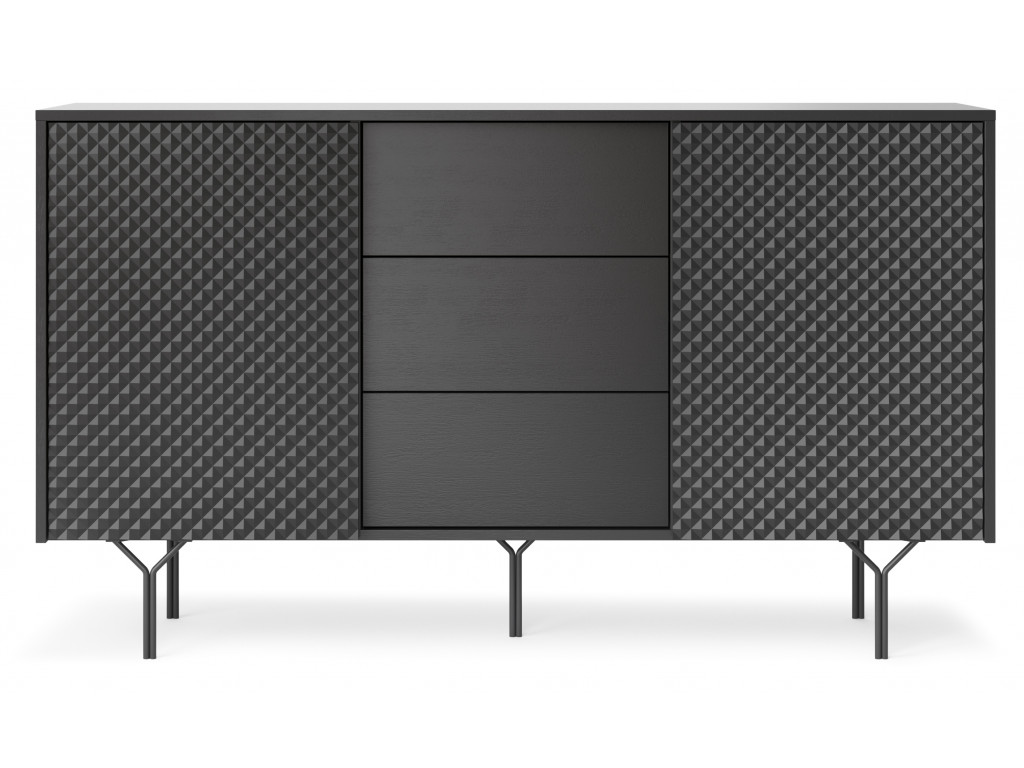 Moderná komoda Raven v čiernom matnom prevedení vnesie do obývačky, chodby či jedálne elegantný a nadčasový dizajn. Komoda vyniká moderným dizajnom vďaka frézovaným dvierkam. Eleganciu podčiarkujú čierne oceľové nožičky na ktorých stojí. Komoda je vyrobená z kvalitnej drevotrieskovej dosky ukončenej ABS hranami. Predná strana je vyrobená z MDF dosky.