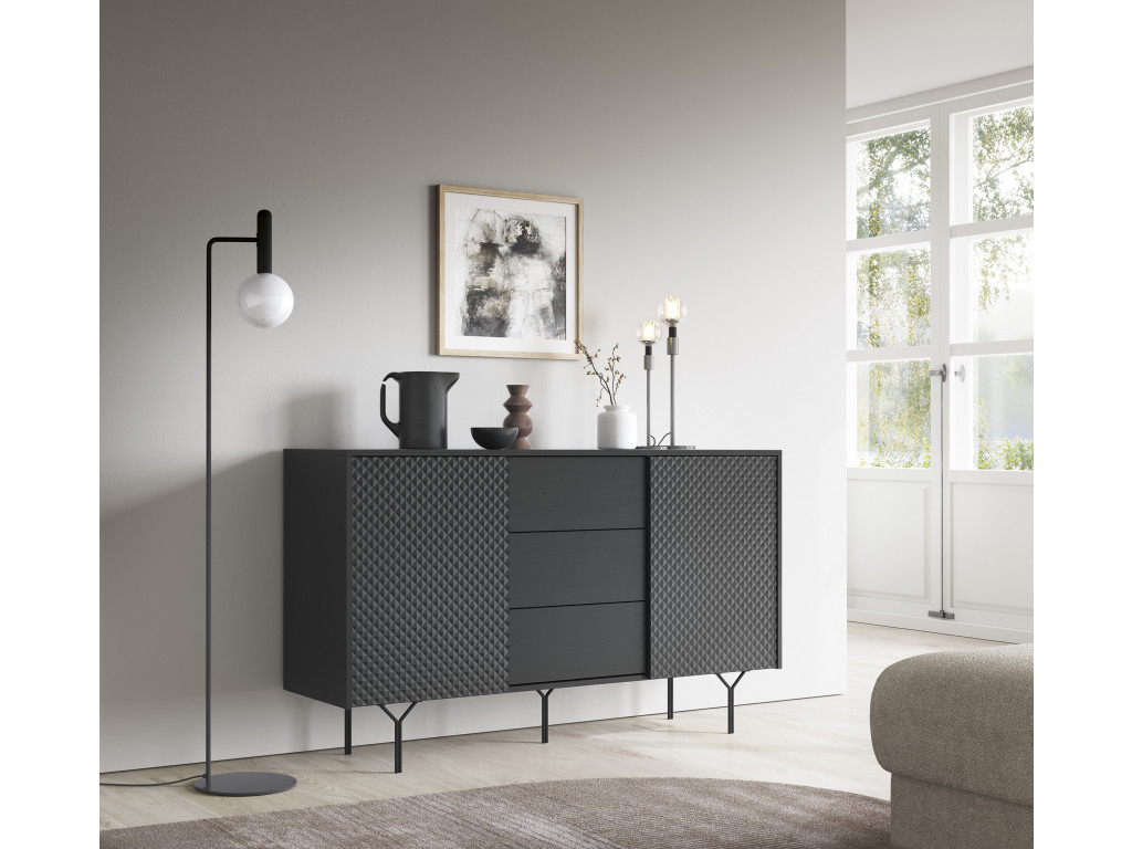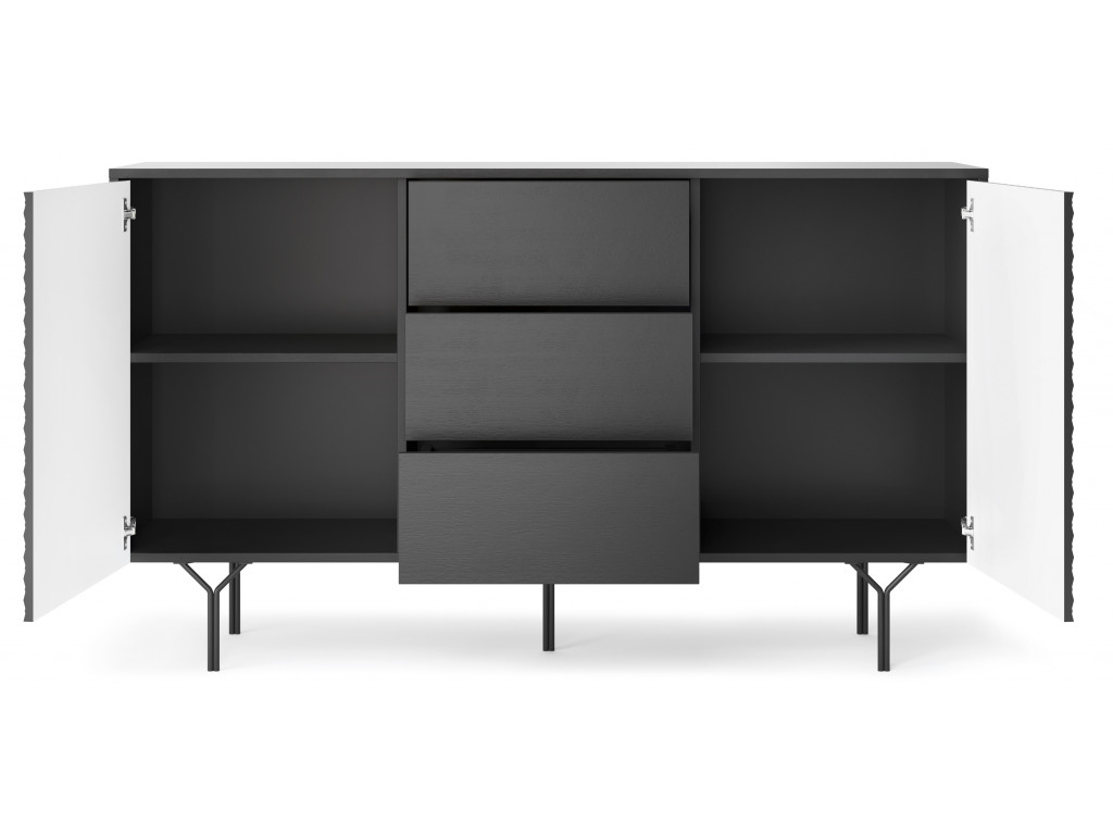 Komoda Raven nemá úchytky, na otvorenie dvierok vám poslúži systém Push to Open. Priestranná komoda poskytne dostatok priestoru na uloženie všetkého, čo potrebujete. Disponuje 3 zásuvkami a policami. Celkový vzhľad vnesie do interiéru luxusný nádych.
