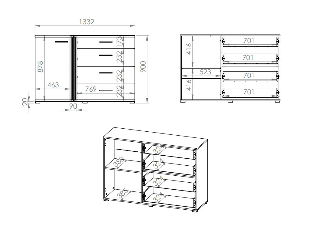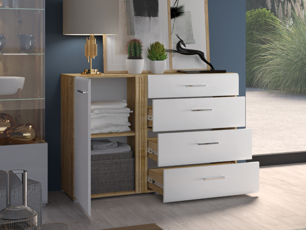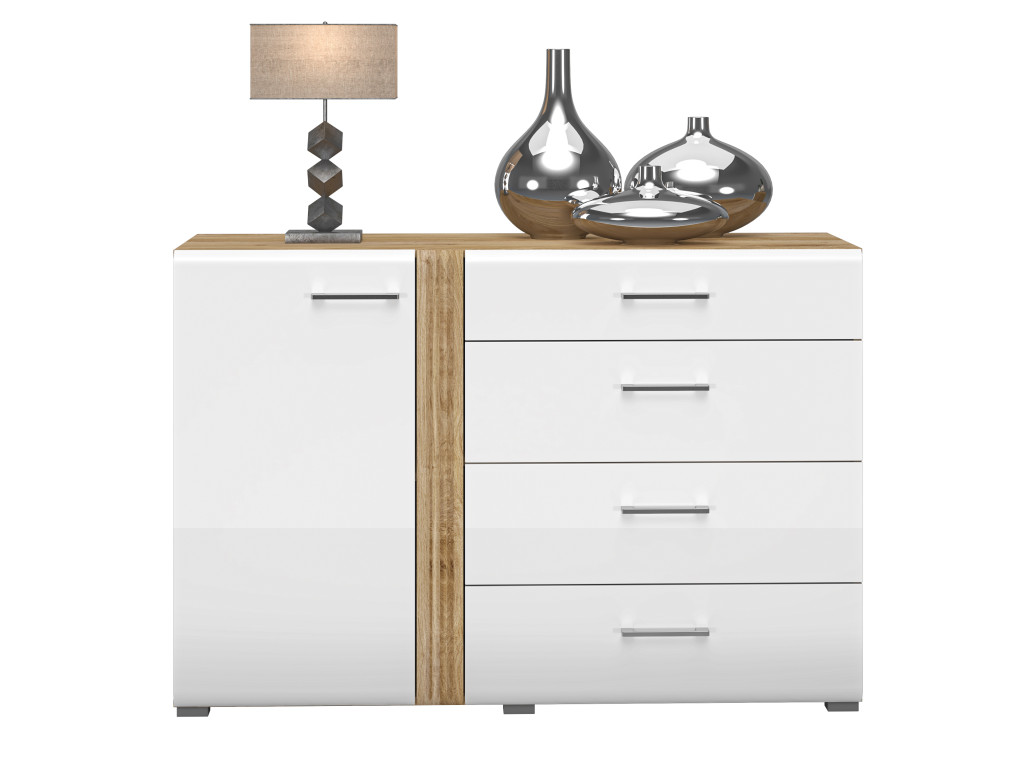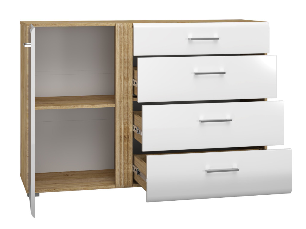 Komoda Adagio 04 kombinuje lesk s praktickým využitím s jednými dvierkami na ľavej strane a štyrmi priestrannými zásuvkami napravo. V prevedení biely lesk a dub castello prináša do interiéru eleganciu a funkčný úložný priestor.