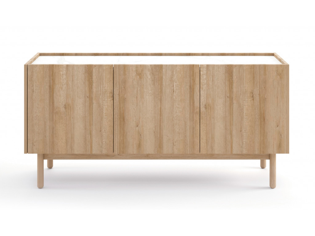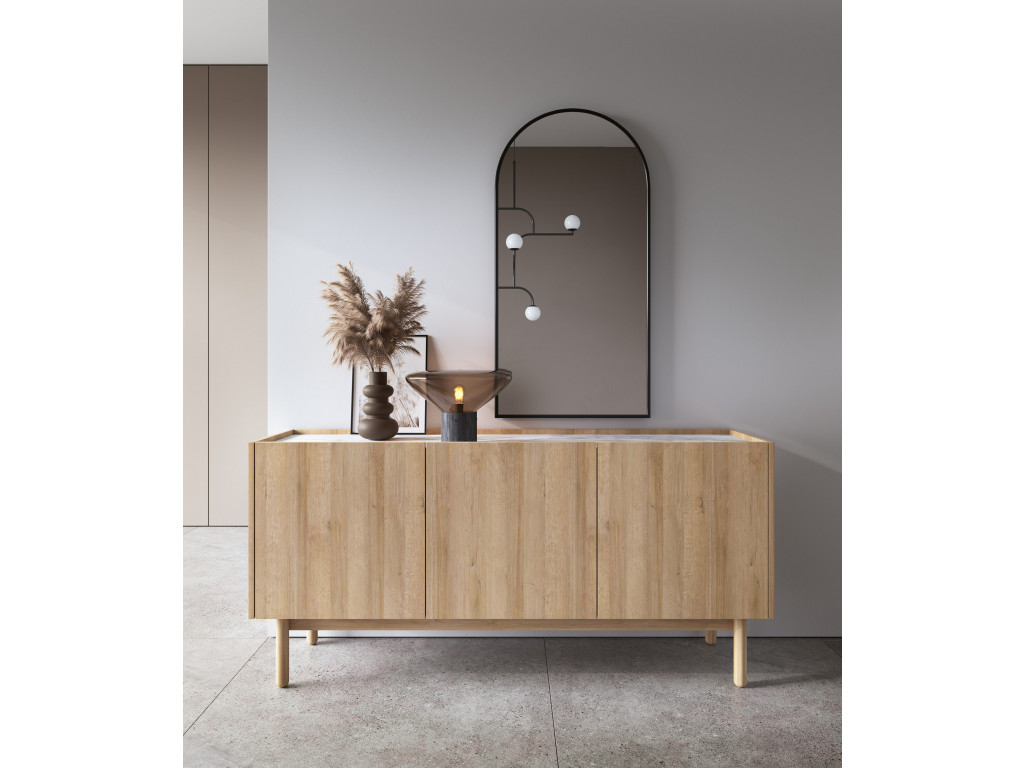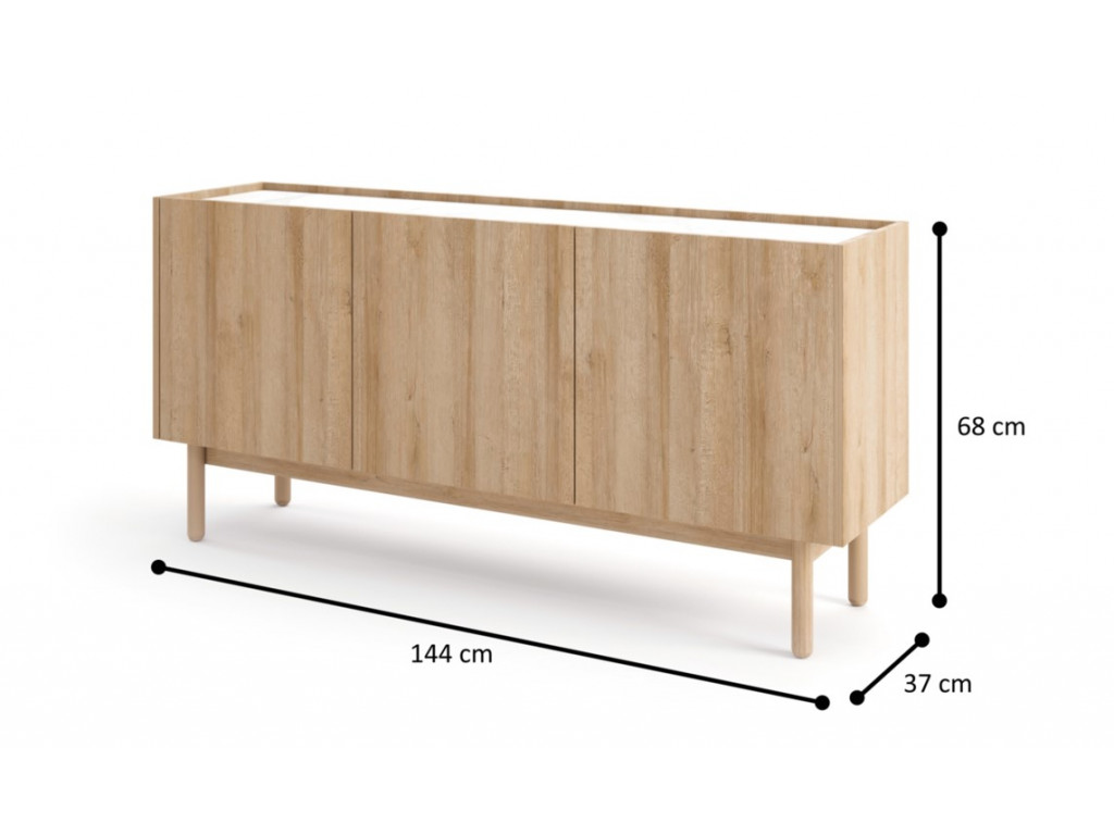 Široká komoda Boho má 3 dvierka, za ktorými sa nachádza 6 políc. Zariadite si ňou chodbu, obývačku či spálňu. Vhodná pre tých, ktorí milujú minimalizmus. Komoda v odtieni dub riviera je v kombinácií s bielym mramorom.