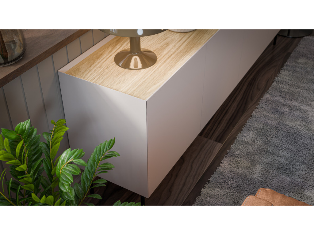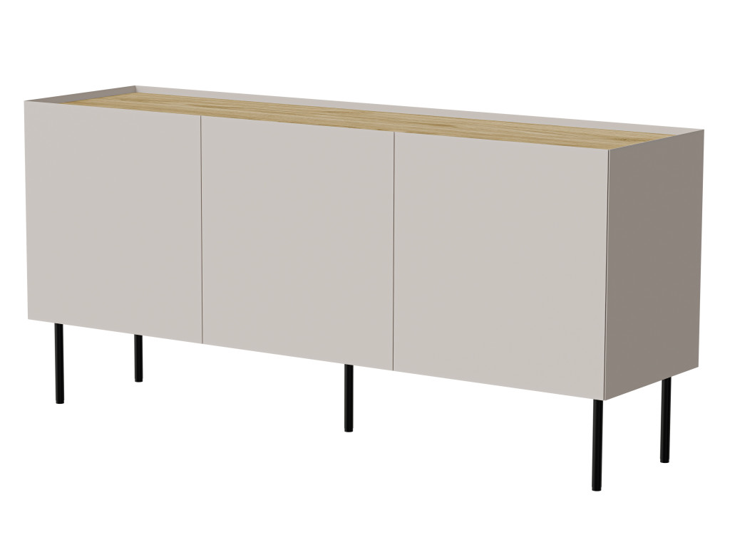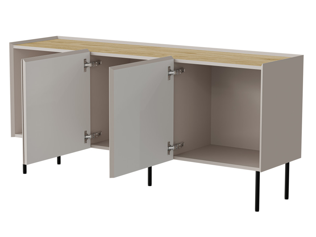 Elegantná komoda Fellini 150 v kašmírovo béžovej farbe prinesie do interiéru teplo a harmóniu. Matné lakované povrchy, vrchná doska v dekore dub olejovaný a šikmé hrany pôsobia moderne a vkusne. Vďaka bezúchytovému otváraniu a kovovým nožičkám vyniká svojou čistou a nadčasovou estetikou.