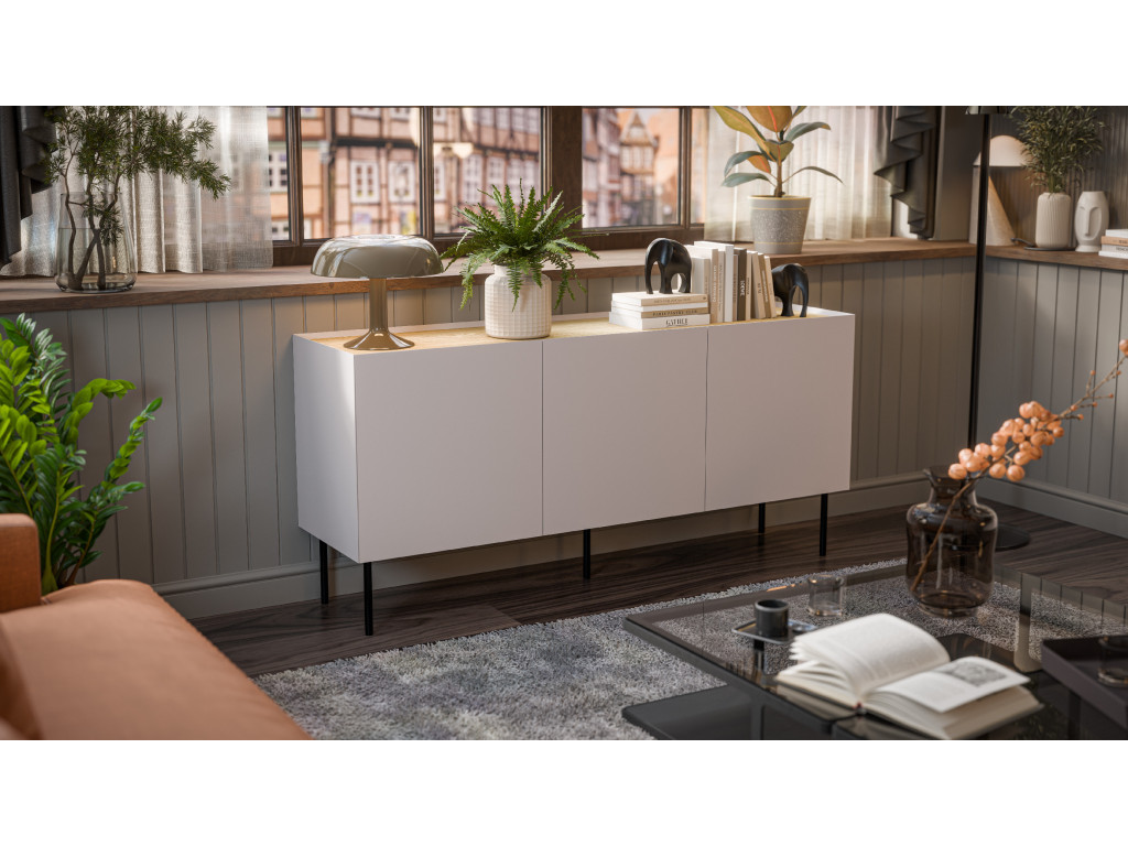 Komoda je vyrobená z lakovanej MDF dosky hrúbky 16 mm v matnom prevedení, ktoré pôsobí elegantne a je príjemné na dotyk. Tri dvierka otvárané smerom do stredu ukrývajú praktické úložné priestory – ideálne na oblečenie, textílie či doplnky. Bezúchytové riešenie podporuje čistý minimalistický dizajn, ktorý sa ľahko kombinuje s ostatnými prvkami kolekcie Fellini.