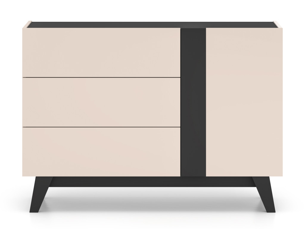 Komoda Freshion 04 predstavuje vkusné prepojenie jemnej béžovej a kontrastnej čiernej, ktoré z nej robí moderný doplnok do akéhokoľvek interiéru. Jednodverové vyhotovenie s vnútorným priestorom ponúka miesto na väčšie predmety či dokumenty, zatiaľ čo tri zásuvky sú ideálne na menšie veci, ktoré potrebujete mať vždy prehľadne usporiadané.