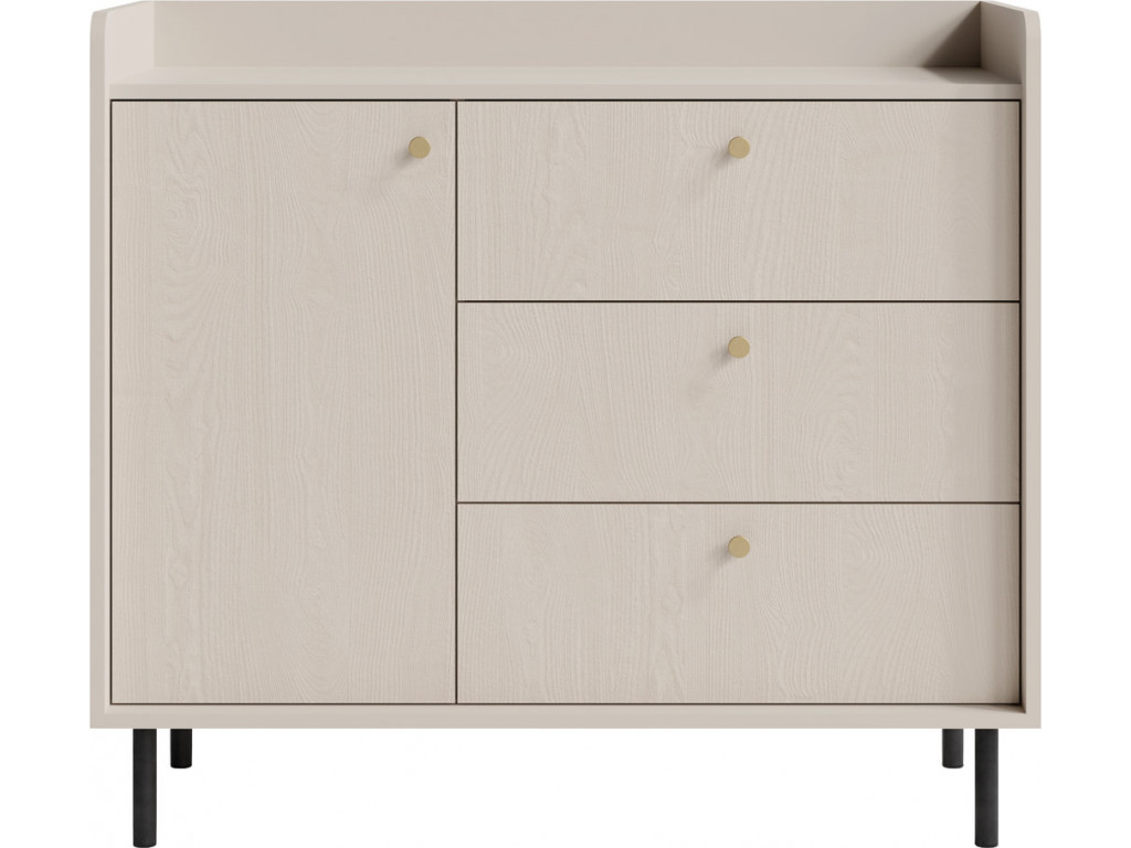 Komoda GRANDE 06 ponúka veľa úložného priestoru v jednej skrinke a troch zásuvkách. Béžová farba na hladkých a štruktúrovaných častiach spoločne s elegantnými zlatými úchytkami dotvorí každý interiér.