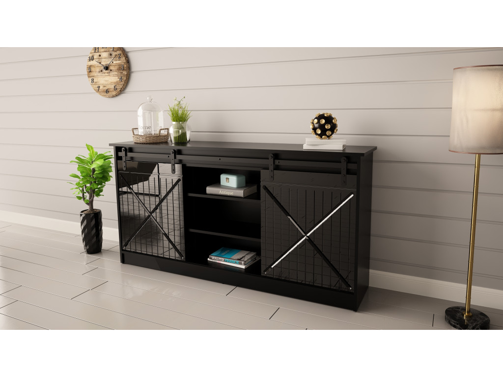 Rustikálna komoda Granero je výsledkom precíznej práce so zmyslom pre detail a štýl. Dvierka na komode sú posuvné na kolieskach, čím sa tento kus nábytku stáva originálnym. Za dvierkami s frézovaním do tvaru X sa nachádza 7 políc. Stredný priestor políc môžete využiť na vystavenie fotografií, váz a iných dekorácií. Matnú čiernu farbu dopĺňajú čierne koľajnice.