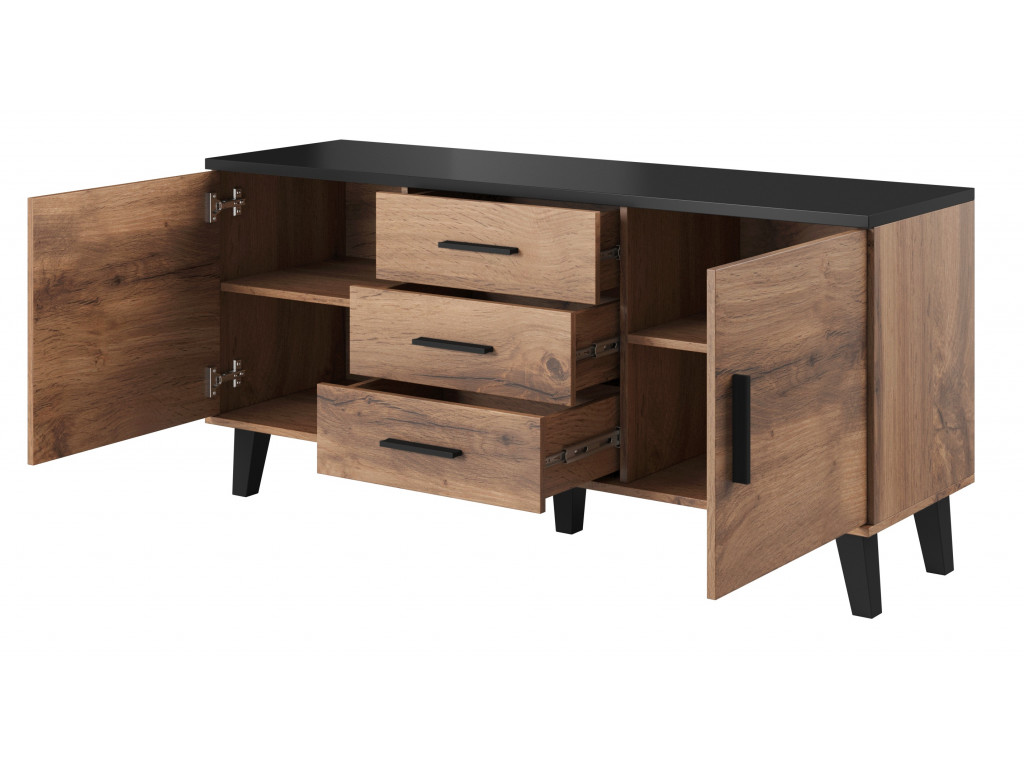 Moderná komoda v dubovej farbe Lotus 2D3S vnesie do interiéru originálny dizajn a praktický priestor. Komoda je vybavená veľkým úložným priestorom vďaka 4 policiam a 3 zásuvkám. Dubové prevedenie v kombinácií s čiernymi nožičkami bude v miestnosti pôsobiť teplo a jedinečne.