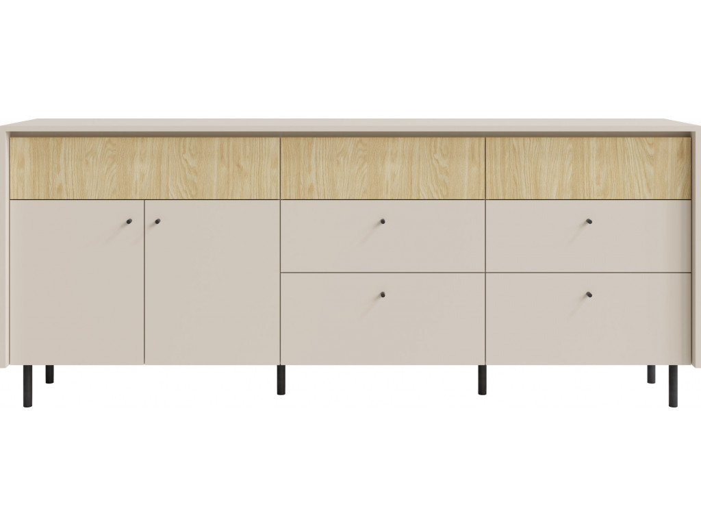Široká komoda Malta 05 je vyrobená z laminovanej dosky (16 mm + ABS - 0,5 mm), ľahko sa udržiava i čistí. K dispozícii v trendovom farebnom prevedení piesková béžová-dub s čiernymi úchytkami a kovovými nožičkami.