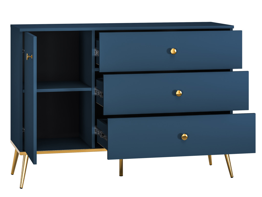 Komoda Marine 04 v tmavomodrom odtieni kombinuje štýl a praktickosť s jednými dvierkami a tromi zásuvkami na prehľadné usporiadanie vecí. Zlaté úchytky a vysoké nožičky dodávajú komode moderný, elegantný vzhľad, ktorý oživí každý interiér.
