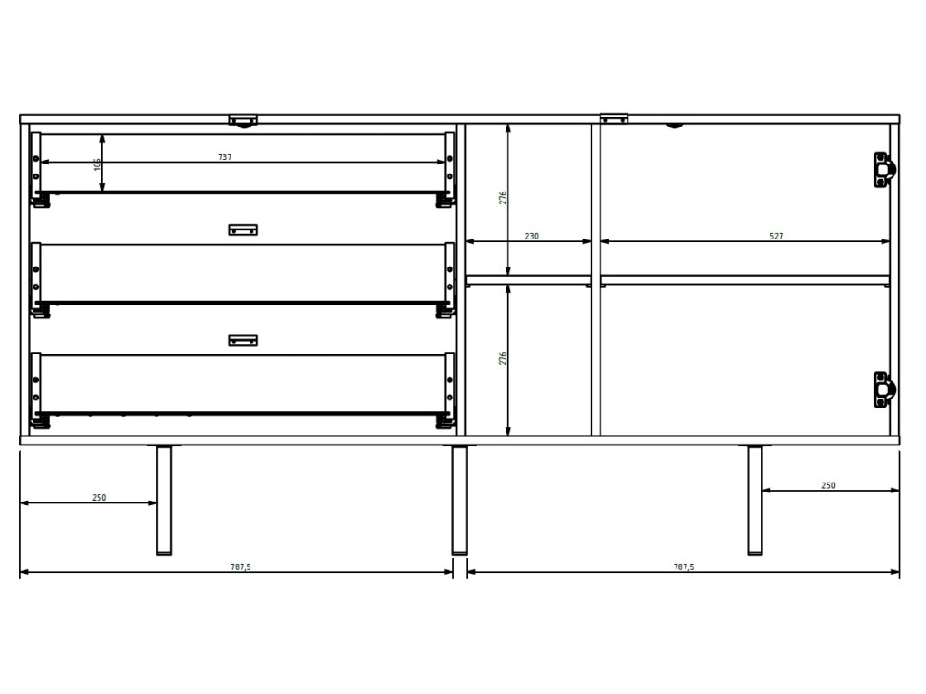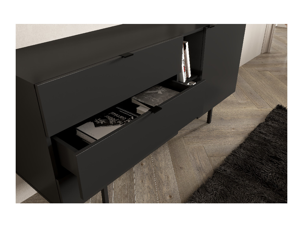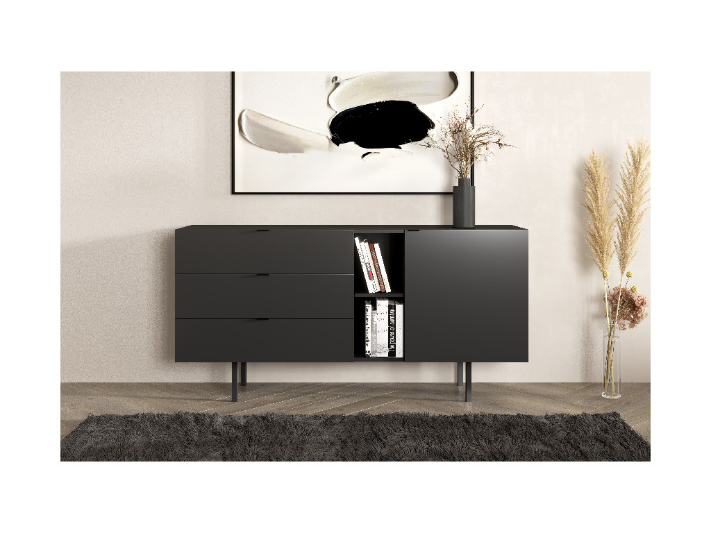 Komoda Myway v elegantnom čiernom polomatnom dizajne predstavuje dokonalú rovnováhu medzi estetickým minimalizmom a praktickou funkčnosťou. Asymetricky usporiadané tri zásuvky, otvorený priestor a jedny dvierka za ktorými sa skrýva polica, poskytujú všestranné možnosti ukladania, ideálne na rôzne typy predmetov od príslušenstva po väčšie elektronické zariadenia.