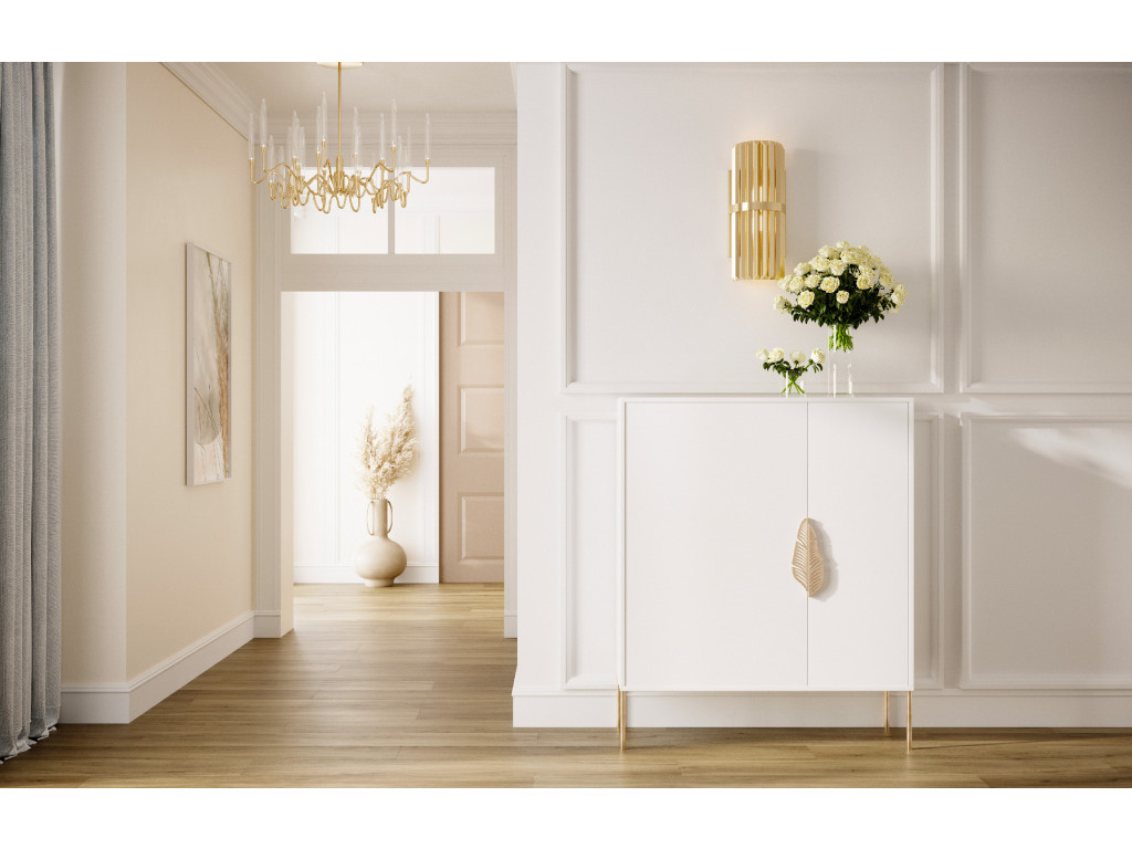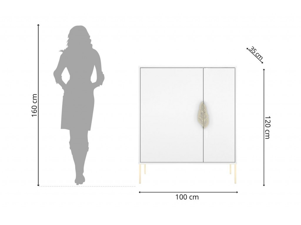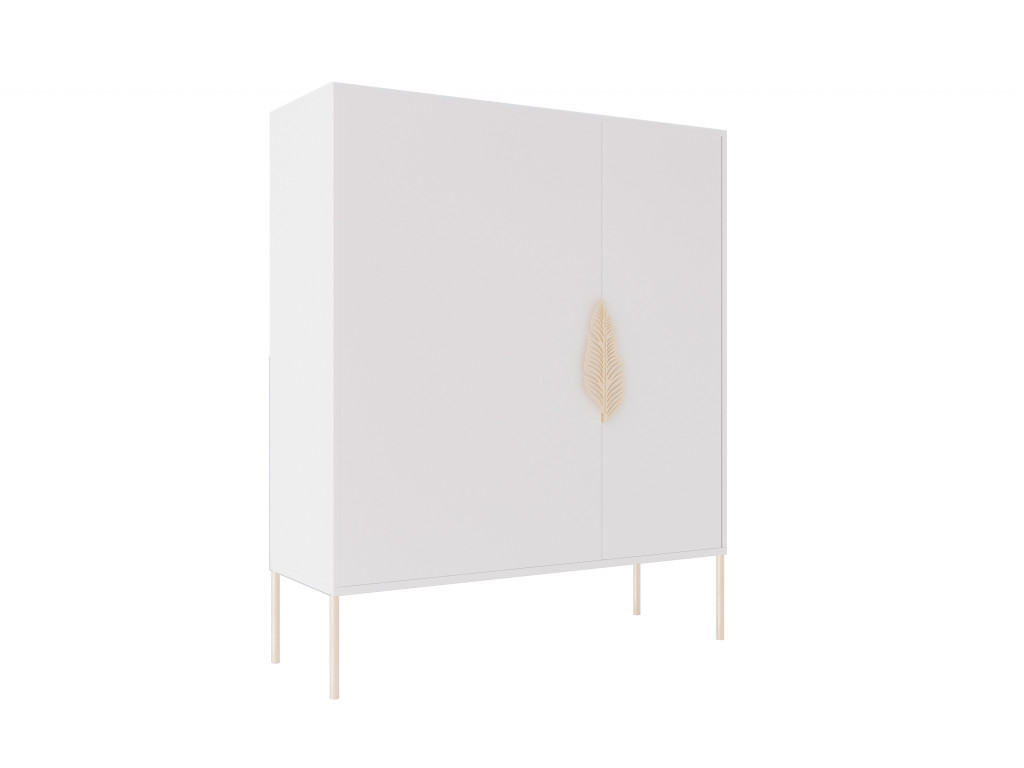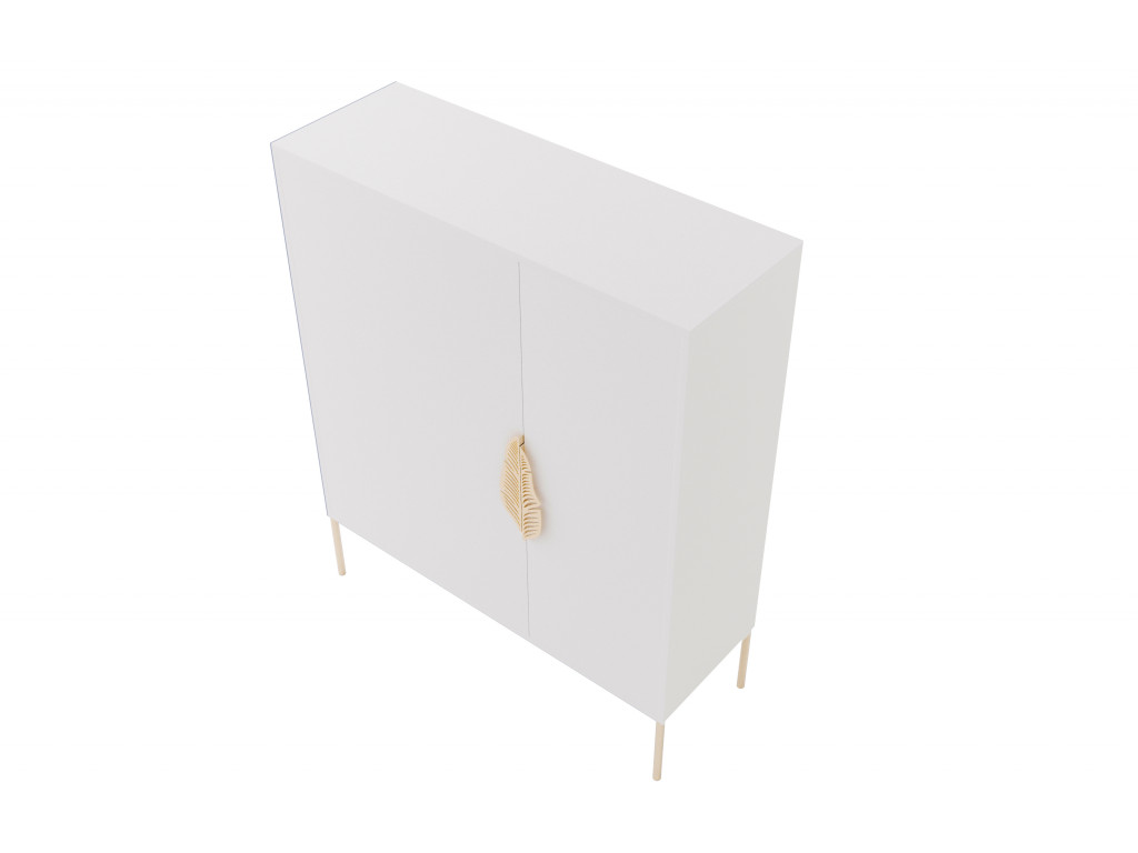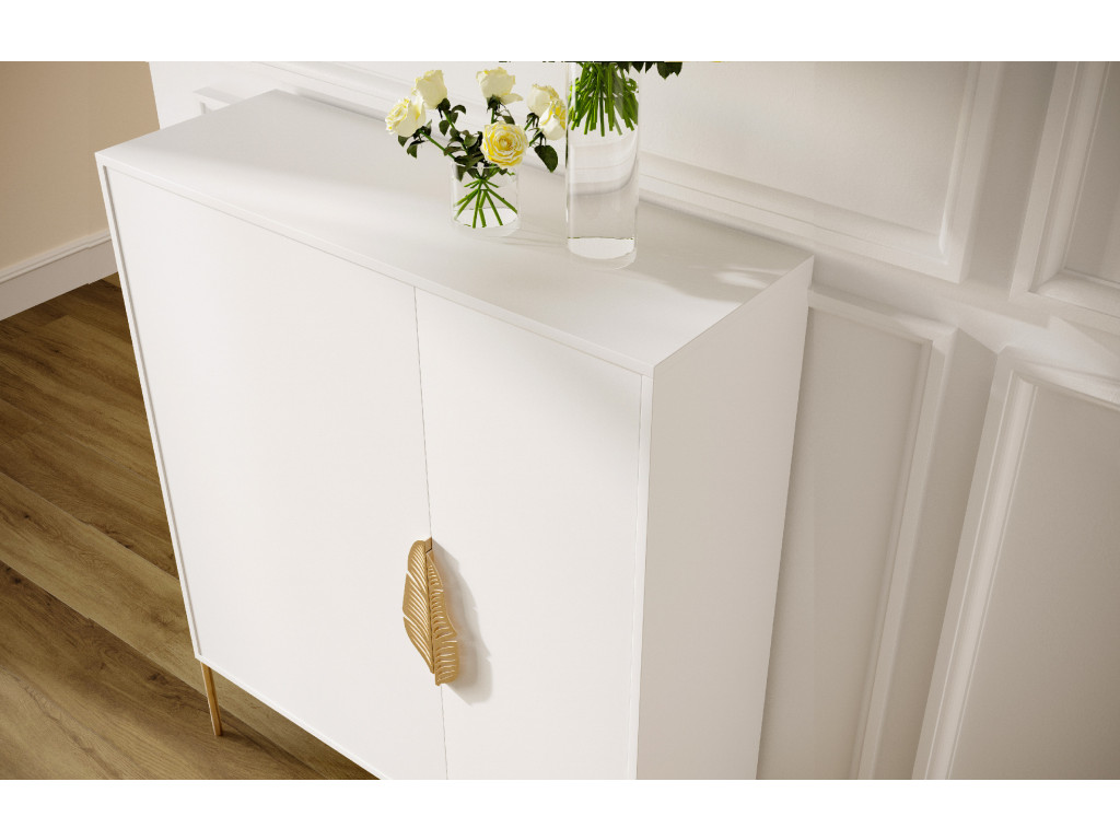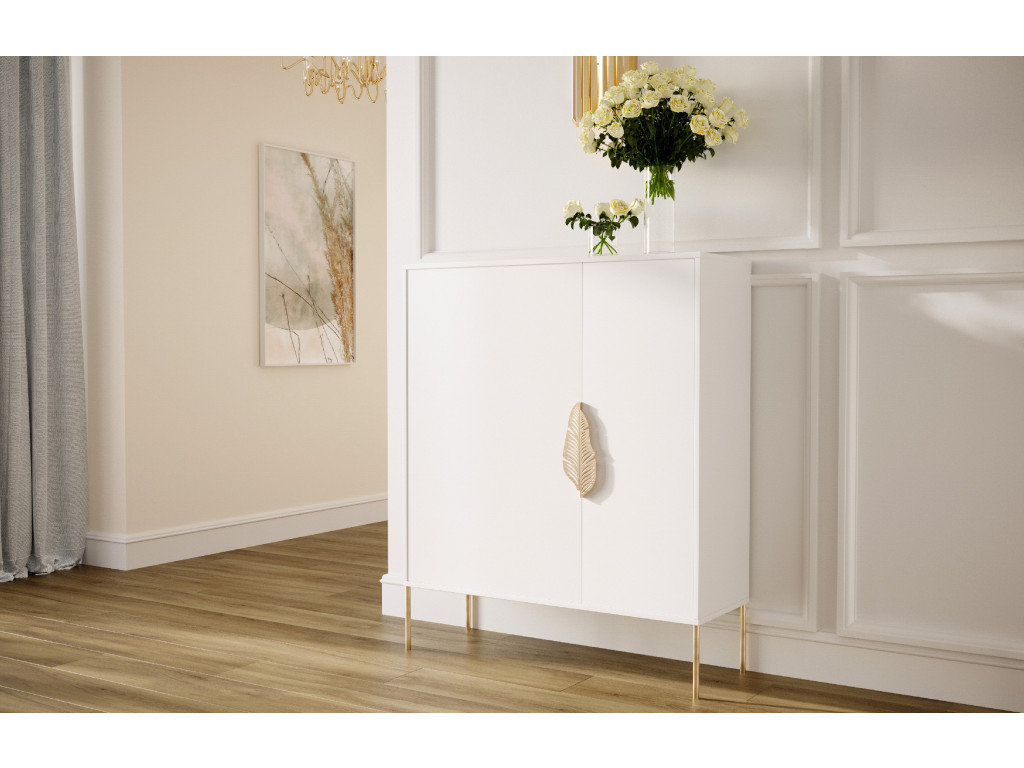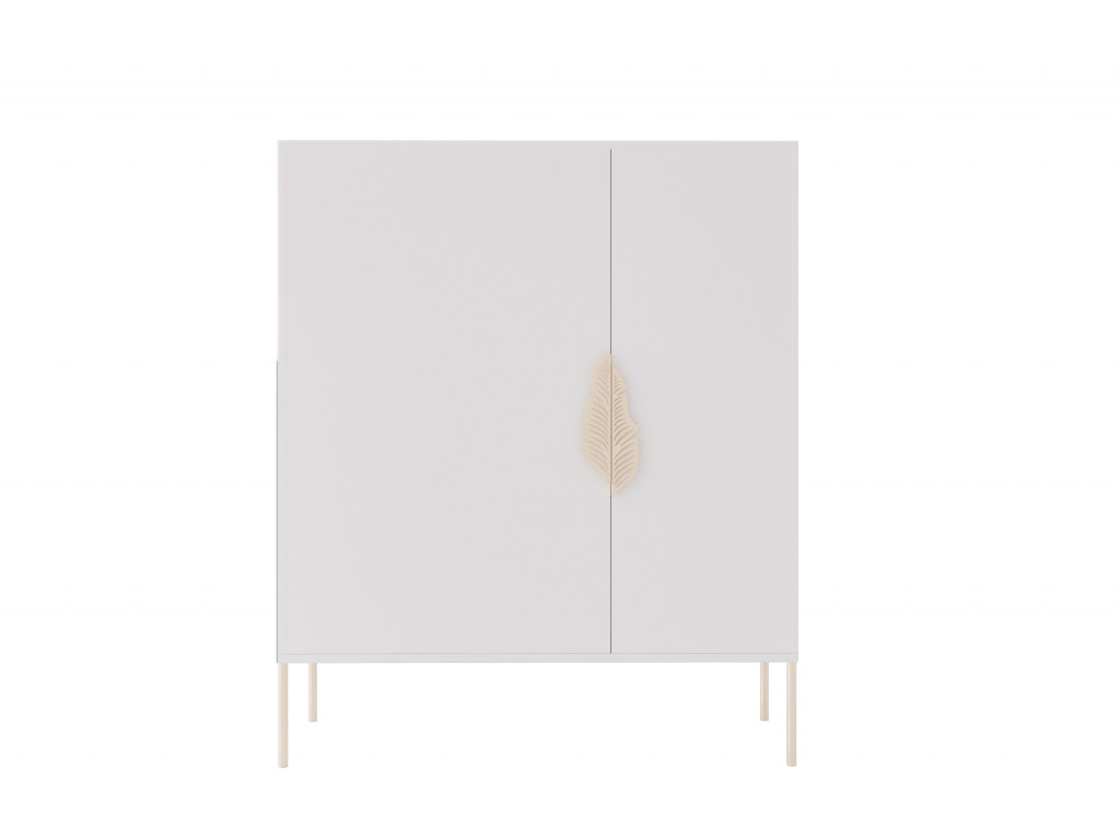 Prvá vec, ktorá zaujme a urobí nábytok krásnym, je veľká, krásna dvojdielna rukoväť v tvare listu z lesklého kovu. Jeho polovice sú voči sebe mierne posunuté, čo je zámerná úprava zdôrazňujúca krásu listu. S madlom dokonale ladia vysoké okrúhle nohy, ktoré upevnené v rohoch podnože prispievajú k stabilite nábytku a uľahčujú udržiavanie poriadku. Prezentovaný model sa osvedčí nielen ako priestranná komoda, ale s úspechom poslúži aj ako elegantný botník.