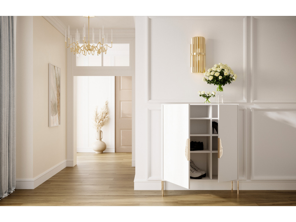 Široká 2-dverová komoda s 8 priestrannými, výškovo nastaviteľnými policami vo vnútri zapadne do každého interiéru. Poteší jednoduchým tvarom, elegantnými dekoráciami a chladnou farbou arktickej bielej.