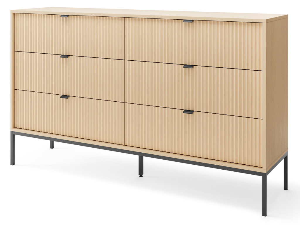 Zásuvková komoda Novas v modernom dizajne vnesie do interiéru luxusný nádych. Je vyrobená z kvalitných materiálov odolných voči poškodeniu. ABS hrany ju robia odolnou voči poškodeniu. Predné drážkované časti sú doplnené o úchytky v čiernej farbe z hliníka. Komoda stojí na čiernej konštrukcii, ktorá jej dodáva ľahkosť.