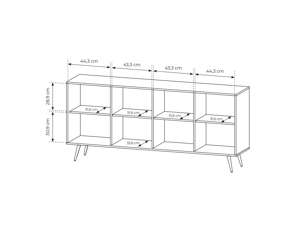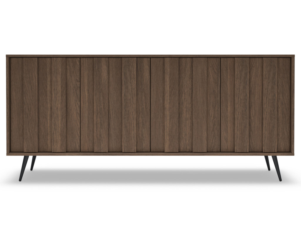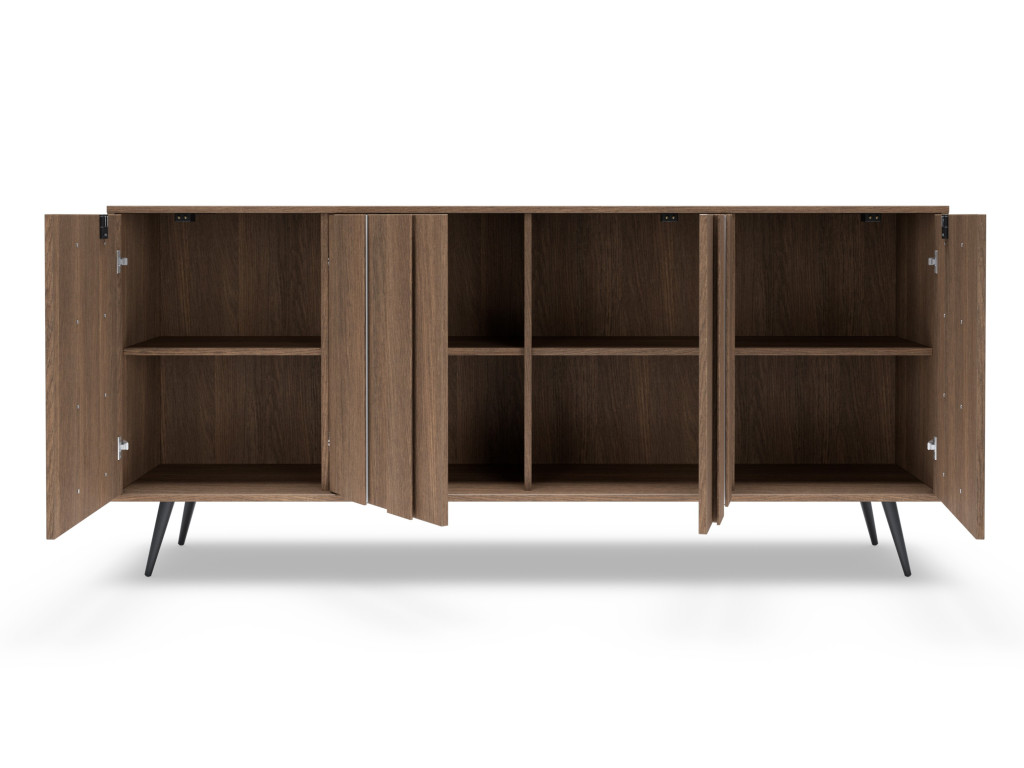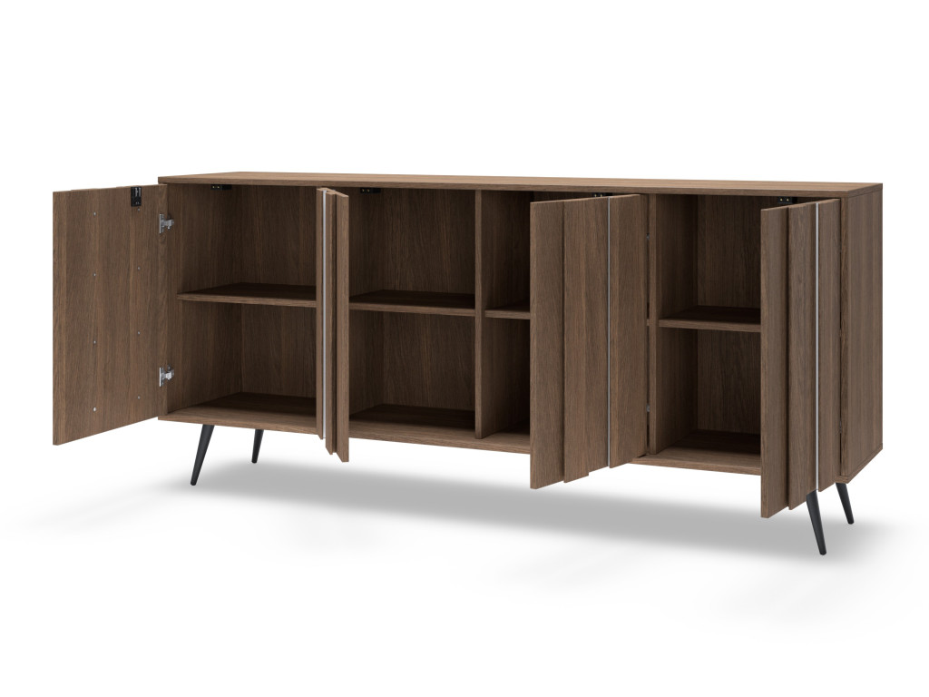 Komoda disponuje štyrmi dvierkami, za ktorými sa nachádza úložný priestor rozdelený policami. Vyhotovená je v dekore dub tmavý (dunin) s dôrazom na moderné prevedenie s MDF lištami na frontoch. Súčasťou je LED osvetlenie integrované vo frontoch. Stabilitu zabezpečujú kovové nohy v čiernej farbe.