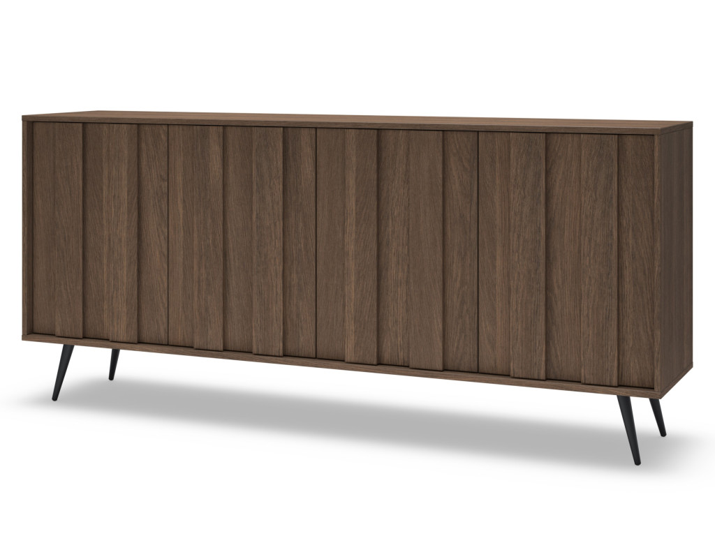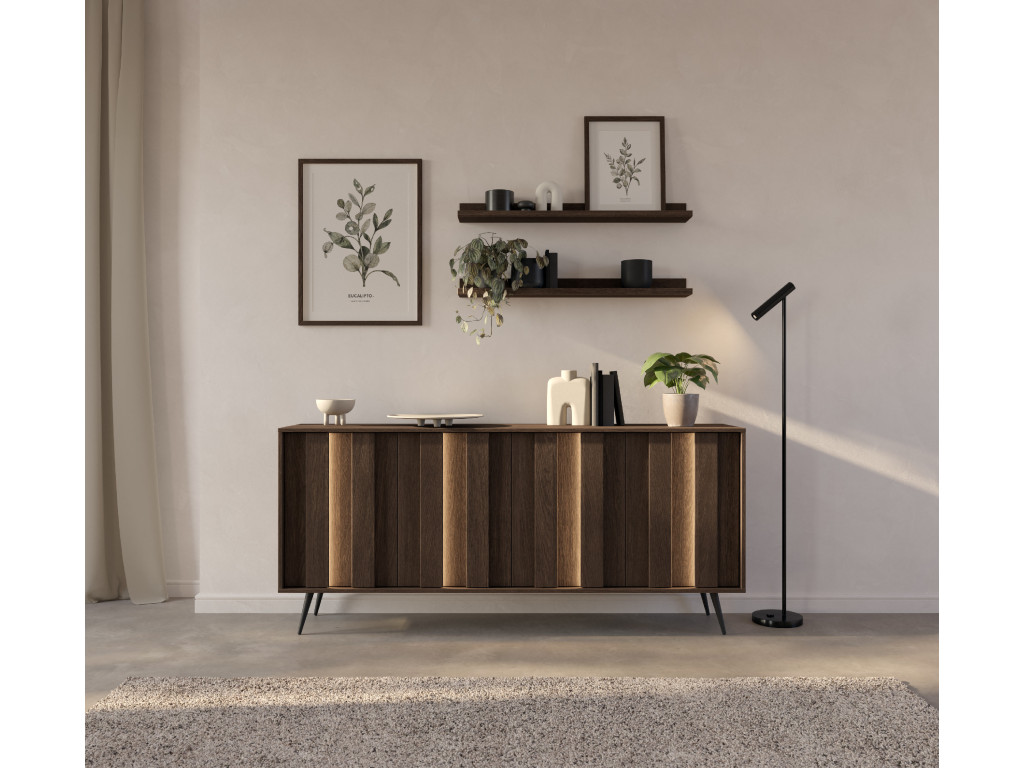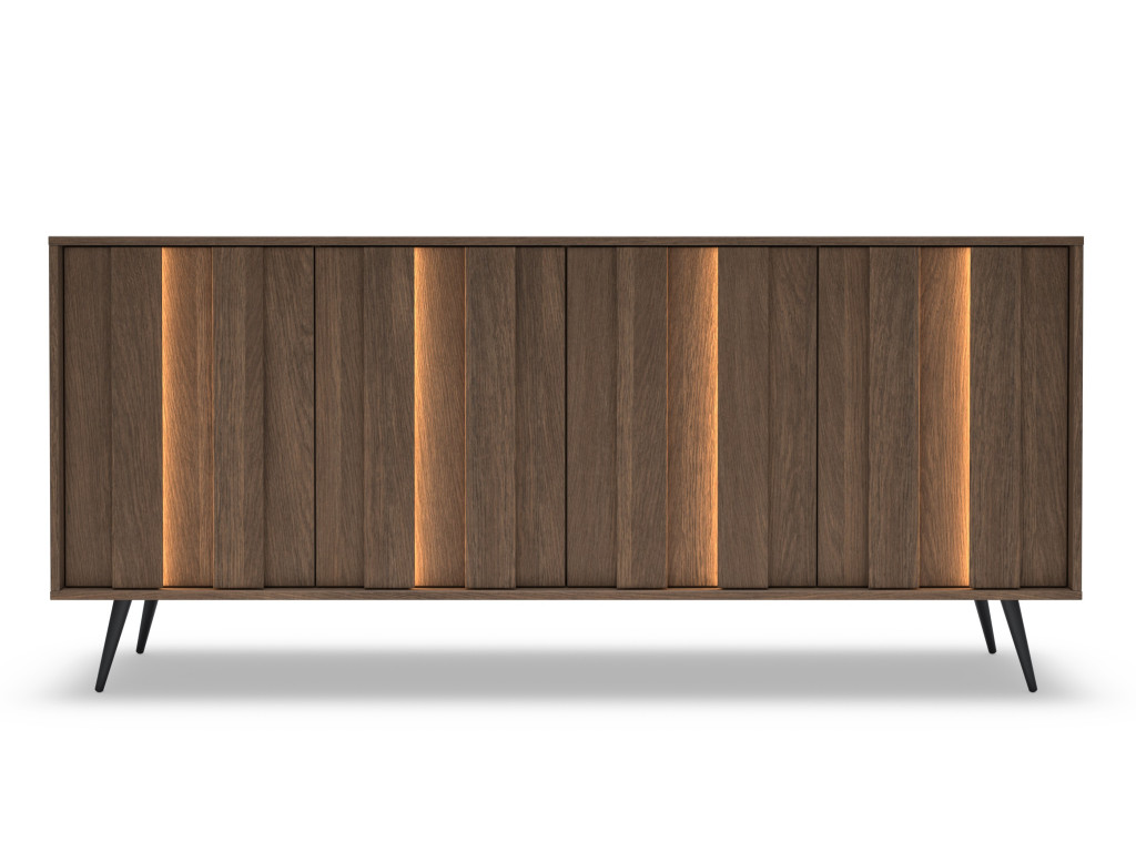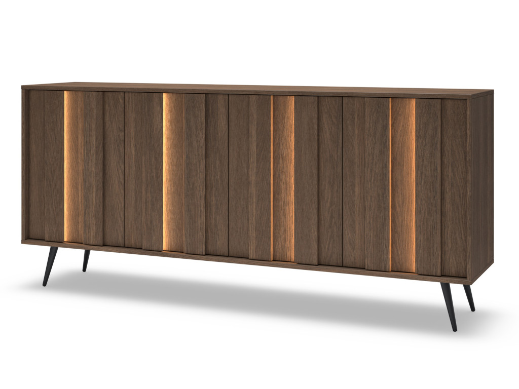 Komoda Amaro C v dekore dub tmavý (dunin) je ideálnou voľbou pre tých, ktorí potrebujú veľkorysý úložný priestor v modernom dizajne. Vďaka štyrom dvierkam ponúka dostatok miesta na prehľadné uskladnenie vecí. Elegantný vzhľad dopĺňajú MDF lišty na frontoch s integrovaným LED osvetlením v teplej bielej farbe, ktoré vytvárajú príjemnú atmosféru. Stabilitu a štýl podčiarkujú čierne kovové nohy, ktoré dodávajú nábytku ľahkosť. Skvele sa hodí do obývačky aj jedálne.