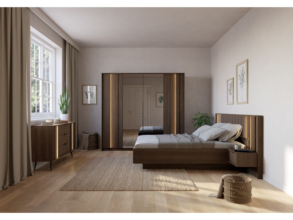 Spálňová časť kolekcie ponúka praktické aj dizajnové riešenia. Dominantou je posteľ s čalúneným čelom s prešívaním (tkanina Runo 26 – Davis) a úložným priestorom na posteľnú bielizeň. Nábytok dopĺňa integrované LED osvetlenie na frontoch a nočných stolíkoch, ktoré vytvára príjemnú atmosféru.