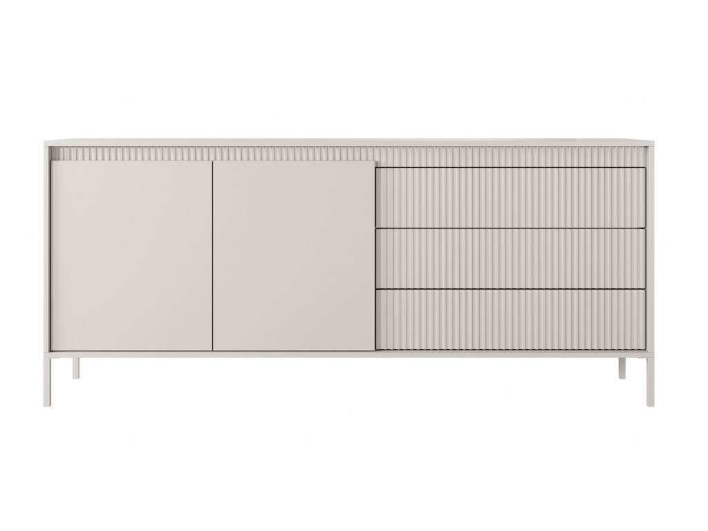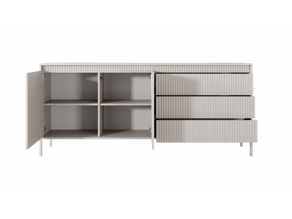 Svetlá béžová komoda Senso je dokonalým predstaviteľom modernej kolekcie s nádychom glamour štýlu. Vyniká efektnými frézovanými dvierkami na zásuvkách a stojí na úzkych kovových nožičkách. Rebrované časti komody sú vkusne doplnené hladkými plochami na dvierkach. Moderná komoda obsahuje dve skrinky s dvierkami a 3 zásuvky s otváraním "push to open".
