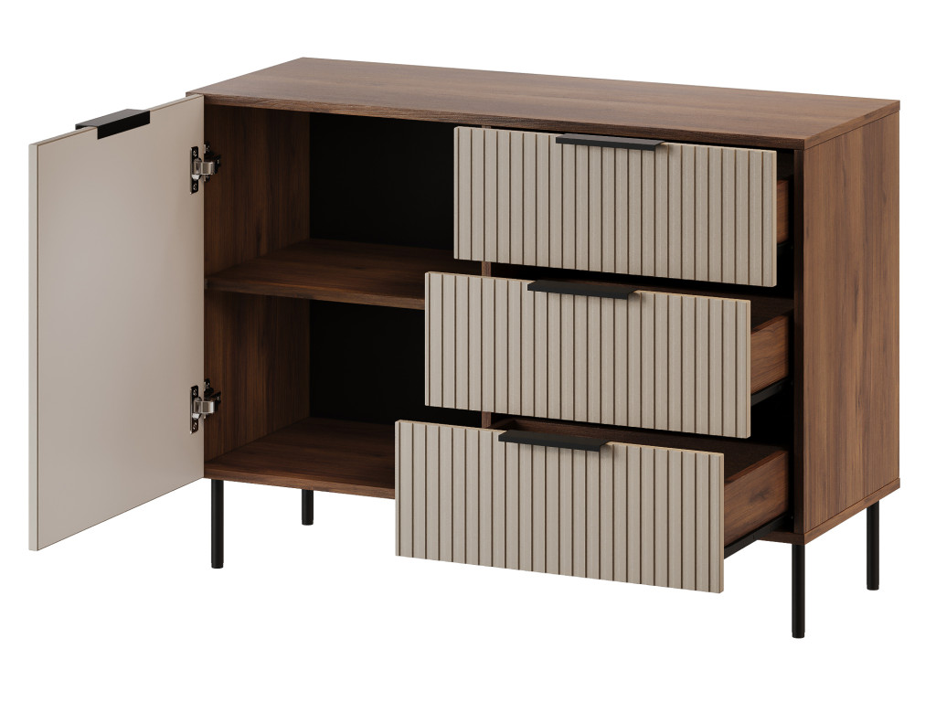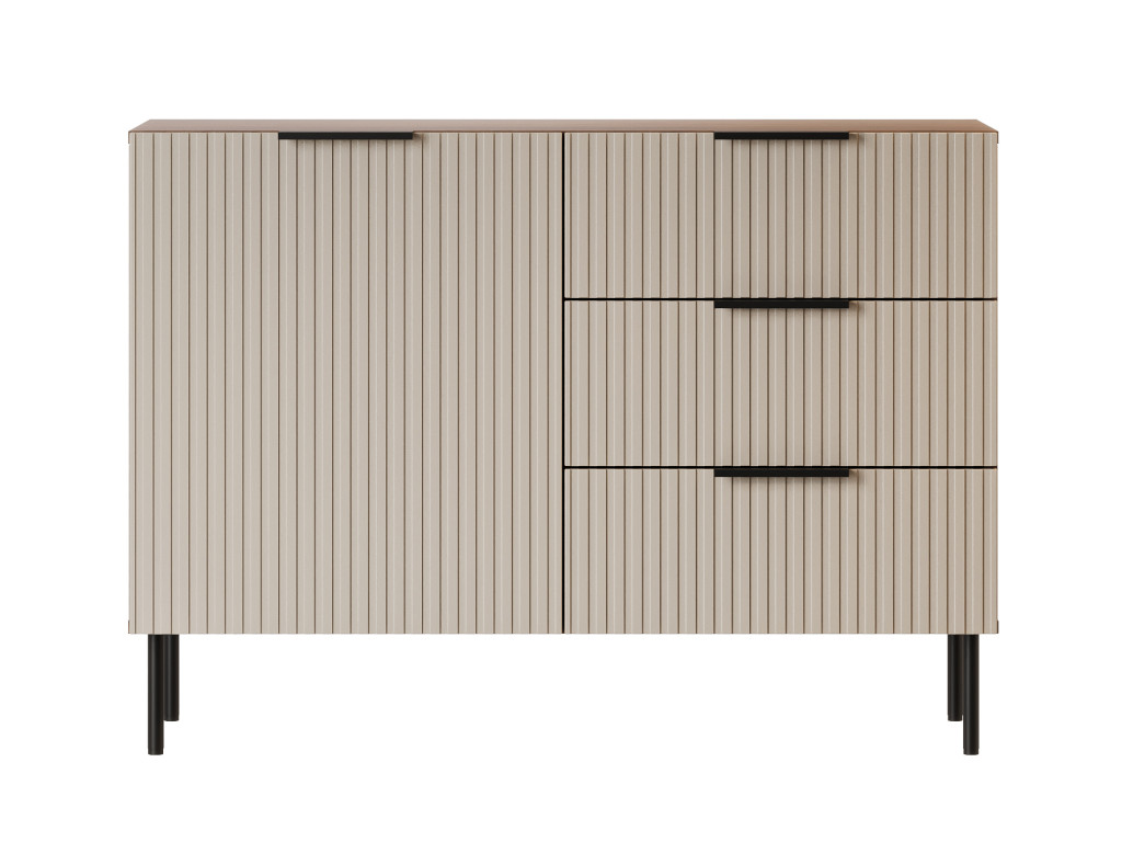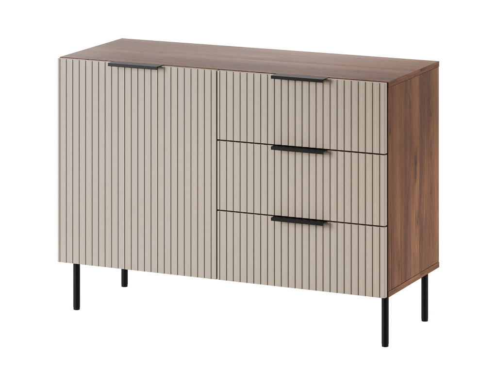 Komoda so zásuvkami Almera 2 vychádza z kolekcie Almera, ktorá sa vyznačuje sviežim dizajnom a efektívnymi úložnými možnosťami, vhodnými do rôznych častí domácnosti. Béžové fronty sú jemne frézované a doplnené teplým orechovým dekorom, čím sa vytvára pôsobivá a nadčasová kombinácia. Čierne kovové prvky na nožičkách a úchytoch vytvárajú výrazný kontrast a dodávajú nábytku dynamiku. Vďaka praktickým zásuvkám ponúka komoda dostatok priestoru na každodenné potreby, pričom zachováva štýlový vzhľad v každej miestnosti.