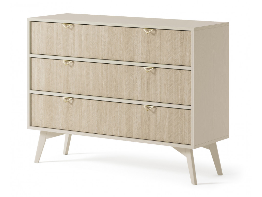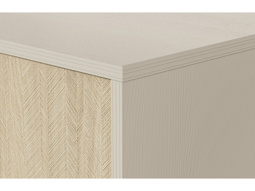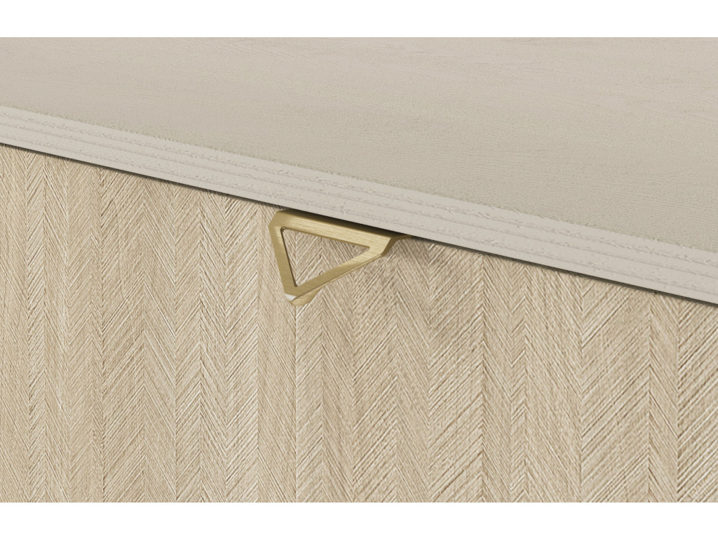 Béžová komoda Forest reprezentuje nábytok v minimalistickom dizajne, ktorý dotvárajú jemné detaily vo vzore rybej kosti a zaujímavé úchyty v zlatej farbe.