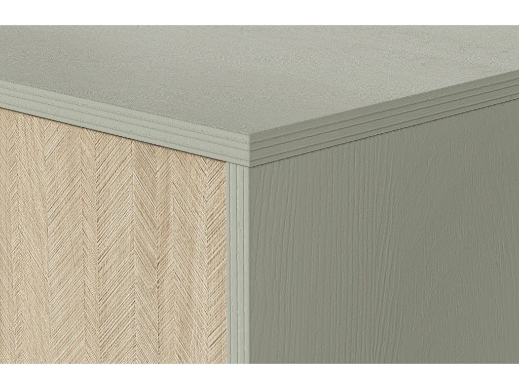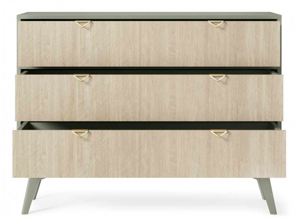 Zelenkavá komoda Forest reprezentuje nábytok v minimalistickom dizajne, ktorý dotvárajú jemné detaily vo vzore rybej kosti a zaujímavé úchyty v zlatej farbe.