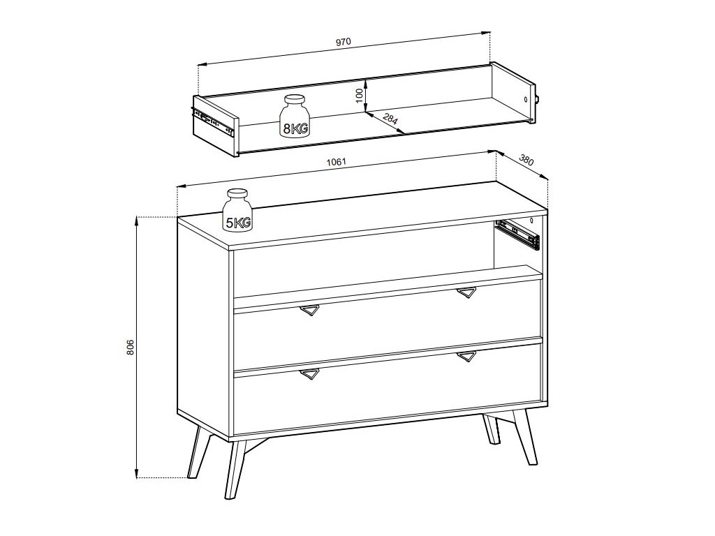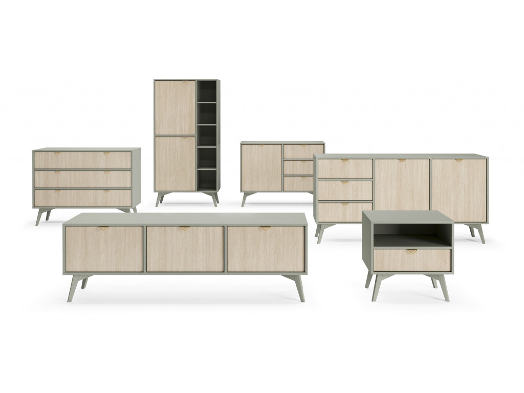 Je vyrobená z kvalitnej laminovanej dosky a zaoblené ABS hrany 0,5 mm sú zárukou vysokej odolnosti. Komoda stojí na vysokých drevených nožičkách. Ľahko sa kombinuje s ďalším nábytkom z kolekcie Forest.