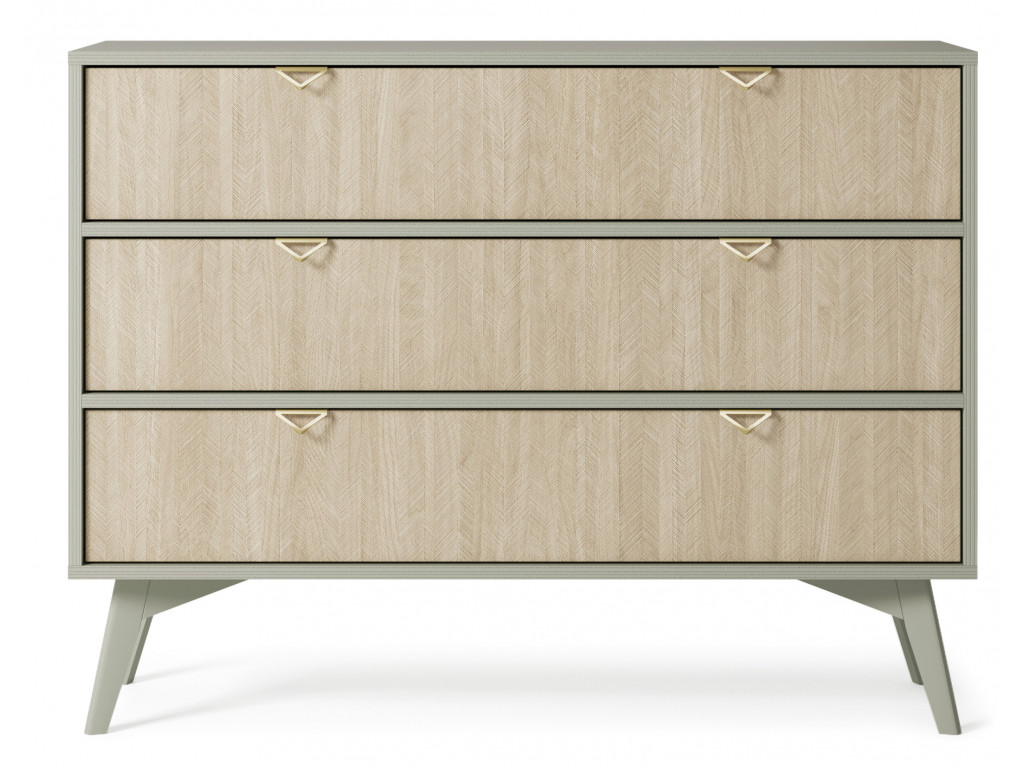 Inšpirujte sa minimalistickým štýlom, ktorý interiéru dodáva útulnosť. Zelená komoda Forest ponúka veľkorysý úložný priestor, ktorý tvoria tri veľké zásuvky. Je vhodná nielen do obývačky, ale aj chodby, jedálne či spálne. Čelá zásuviek sú v béžovej farbe so vzorom rybej kosti.