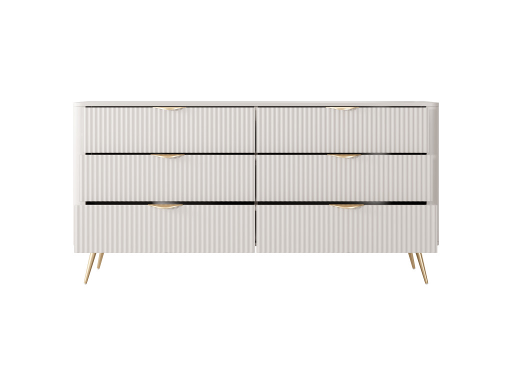 Na komode Lante B vás ako prvé zaujme jej príjemná béžová farba a vrúbkovaný dizajn. O elegantnú stránku komody sa postarali vysoké, zlaté nožičky a zlaté úchytky na otváranie. Komoda disponuje veľkým úložným priestorom vo forme 6 zásuviek. Komoda sa vyznačuje aj absenciou ostrých hrán, čo dodáva nábytku eleganciu a bezpečnosť.