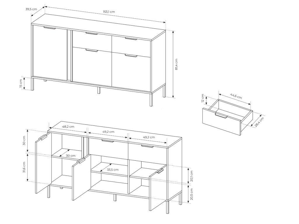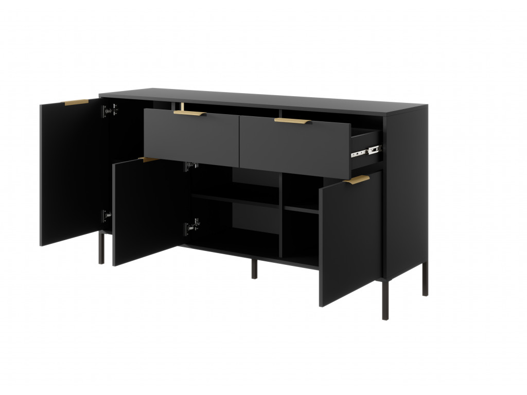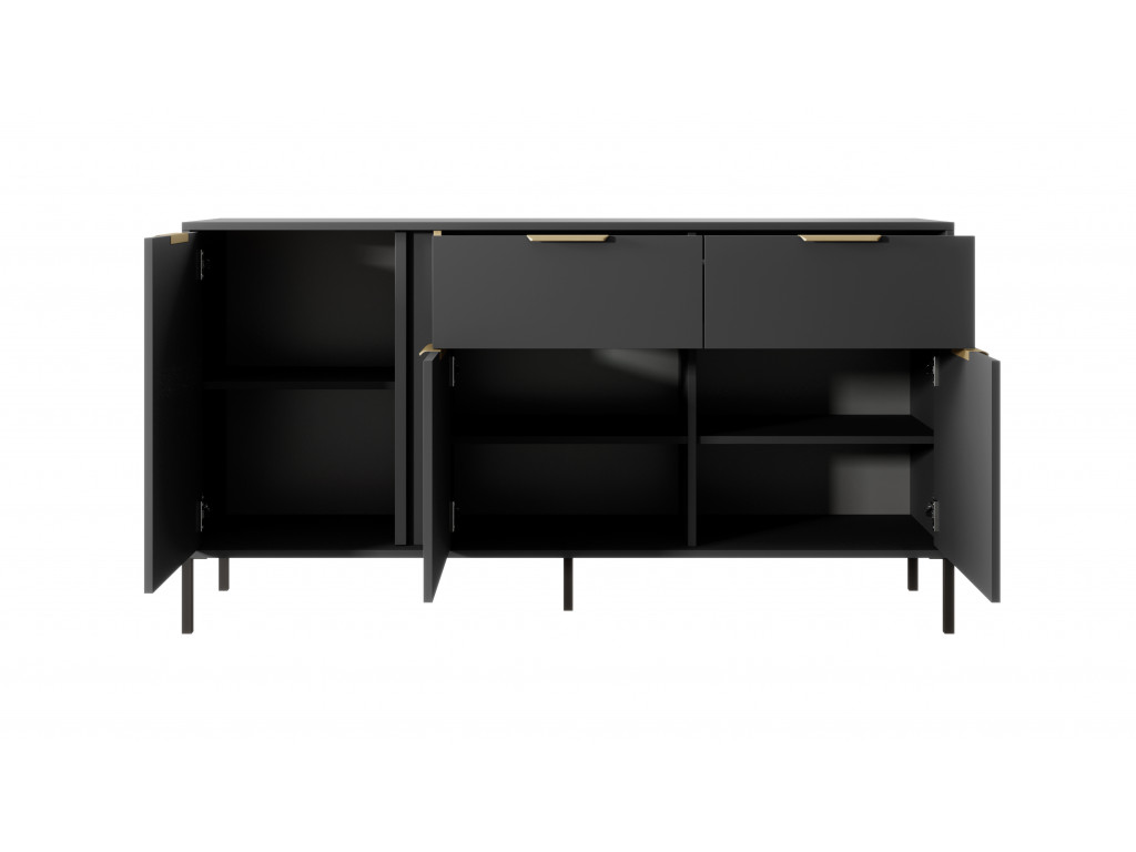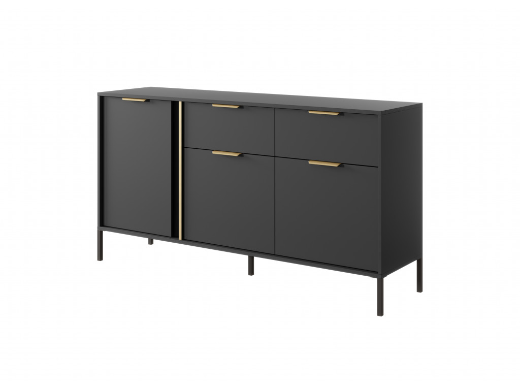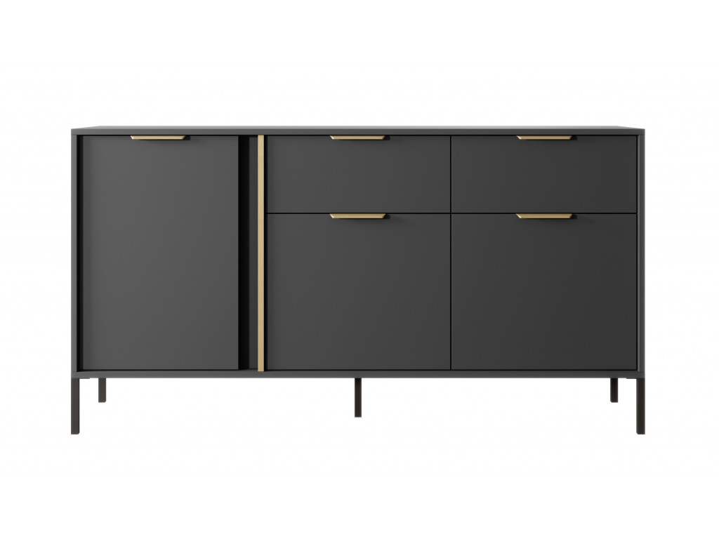 Netradičná komoda Lars ponúka úložný priestor v podobe 3 priestranných skriniek s dvierkami a 2 veľkokapacitných zásuviek so zlatými úchytkami. Antracitové vyhotovenie nábytku dodá miestnosti hĺbku a ľahko sa kombinuje s výraznejšími farbami ďalších doplnkov.