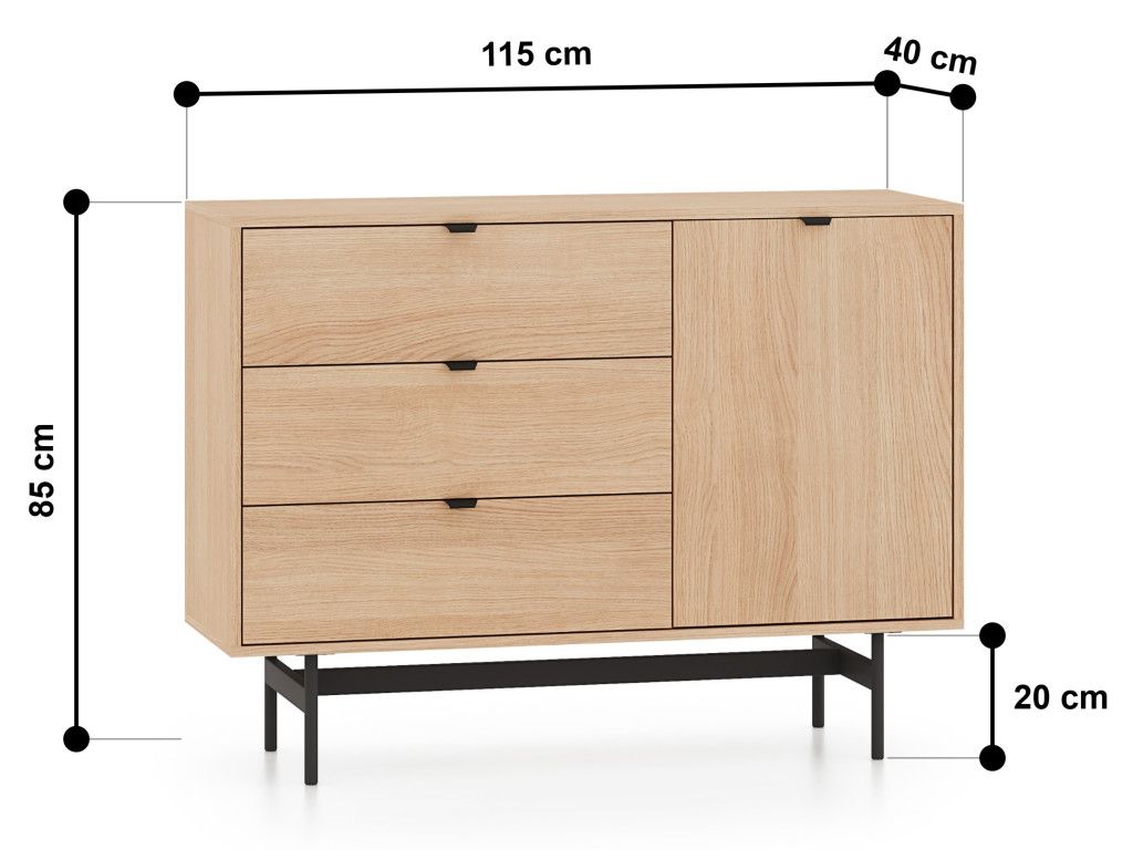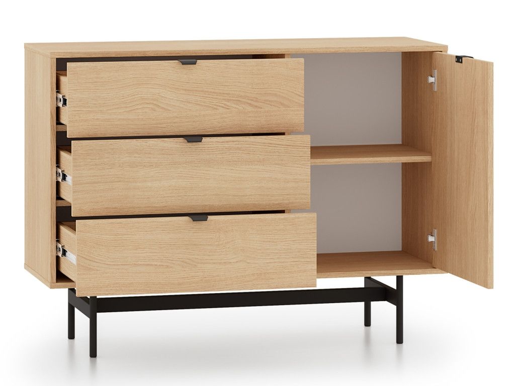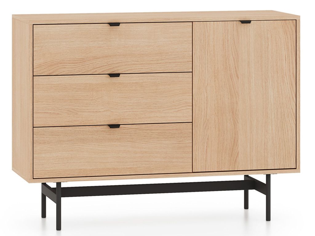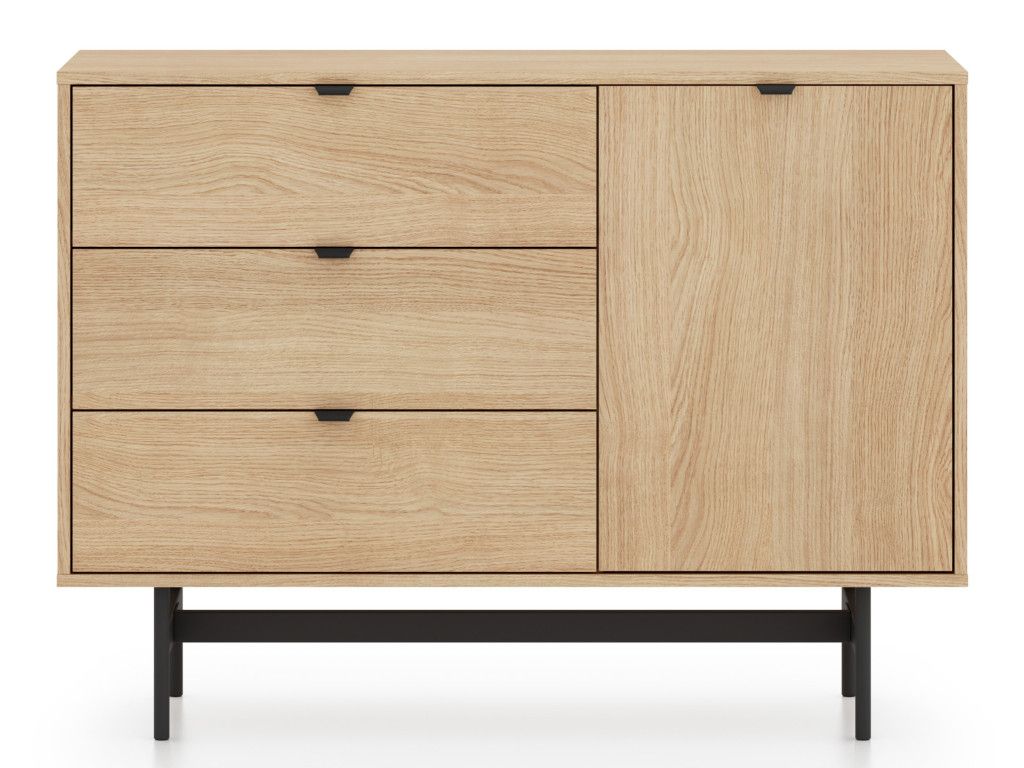 Komoda so zásuvkami Reynos 04 v dekore dub mavelie je praktické riešenie aj do menších priestorov. Kombinácia zásuviek a skrinky umožňuje prehľadné usporiadanie vecí. Moderný vzhľad podčiarkuje spojenie dreva a čiernej kovovej podnože. Plne výsuvné zásuvky a tiché dovieranie zvyšujú komfort pri každodennom používaní.
