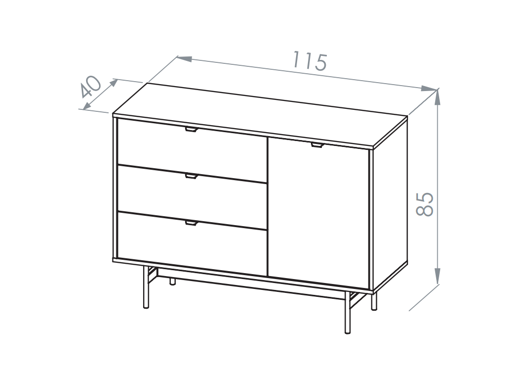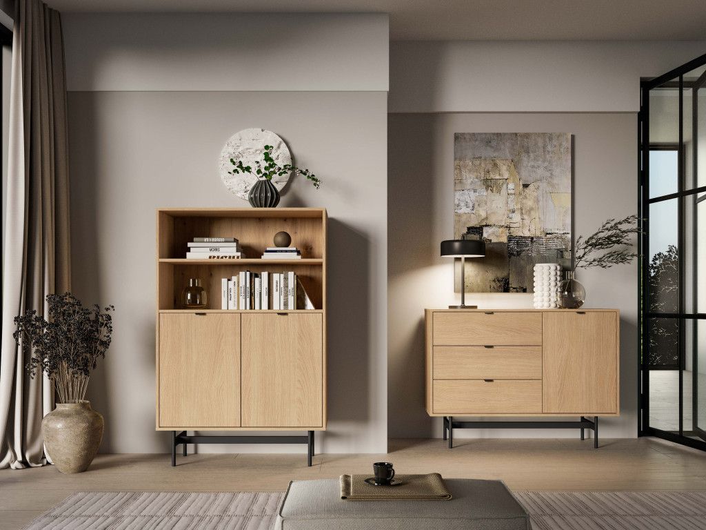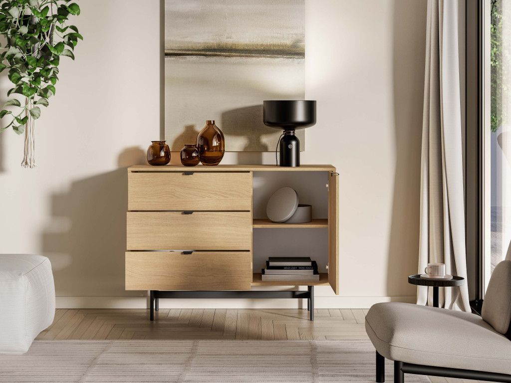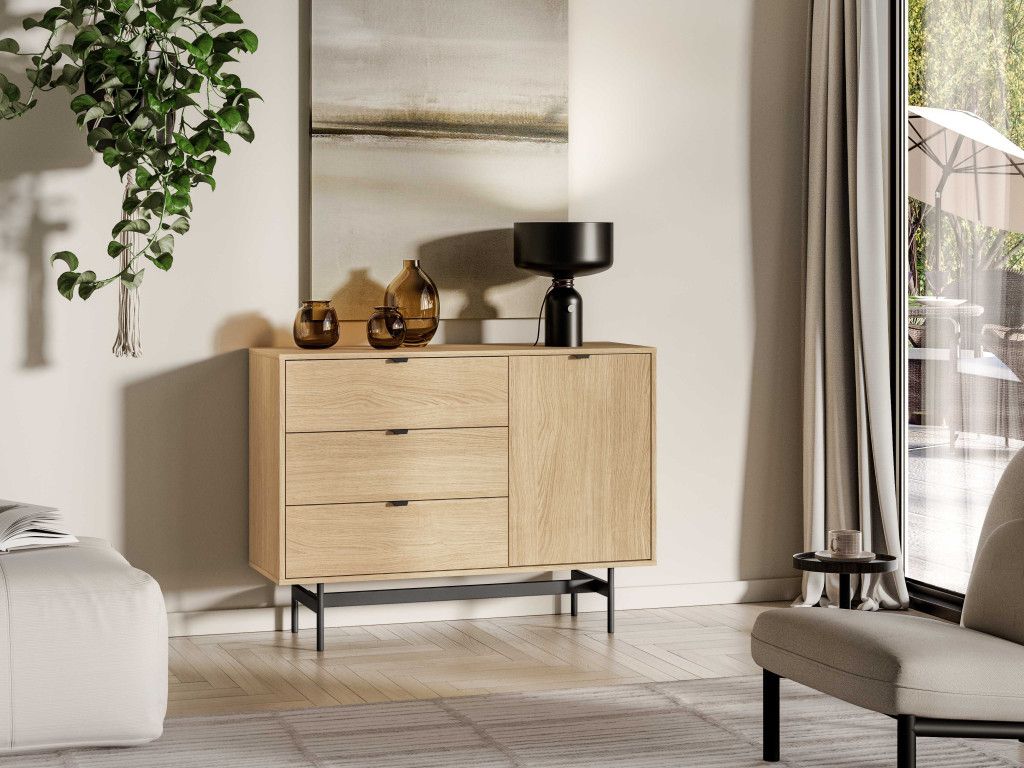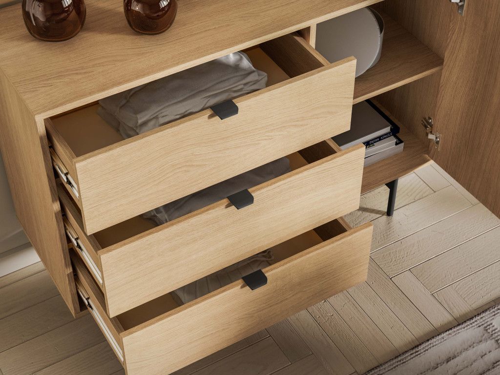 Komoda so zásuvkami Reynos 04 v dekore dub mavelie je praktické riešenie aj do menších priestorov. Kombinácia zásuviek a skrinky umožňuje prehľadné usporiadanie vecí. Moderný vzhľad podčiarkuje spojenie dreva a čiernej kovovej podnože. Plne výsuvné zásuvky a tiché dovieranie zvyšujú komfort pri každodennom používaní.