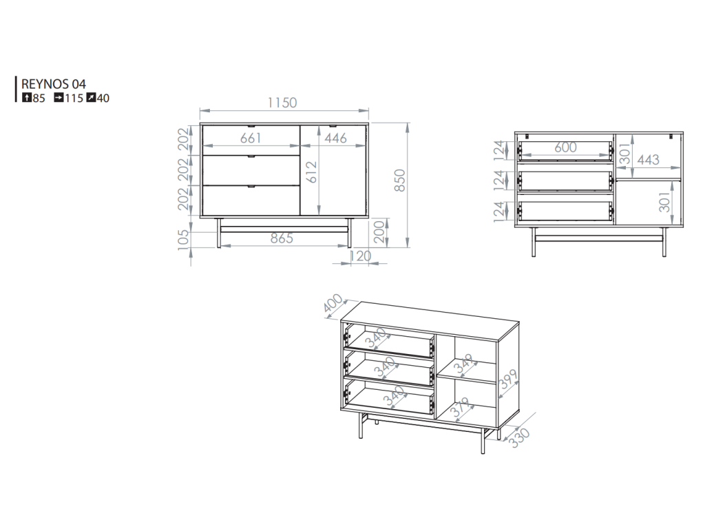 Kompaktná komoda Reynos 04 ponúka praktické riešenie úložného priestoru aj tam, kde je miesta menej. Disponuje tromi hlbokými zásuvkami, ktoré zabezpečujú rýchly prístup k menším predmetom a textíliám. Bočná skrinka poskytuje dodatočný uzavretý priestor na väčšie veci alebo doplnky. Komoda stojí na vysokej kovovej podnoži, ktorá dodáva ľahkosť a uľahčuje údržbu podlahy.