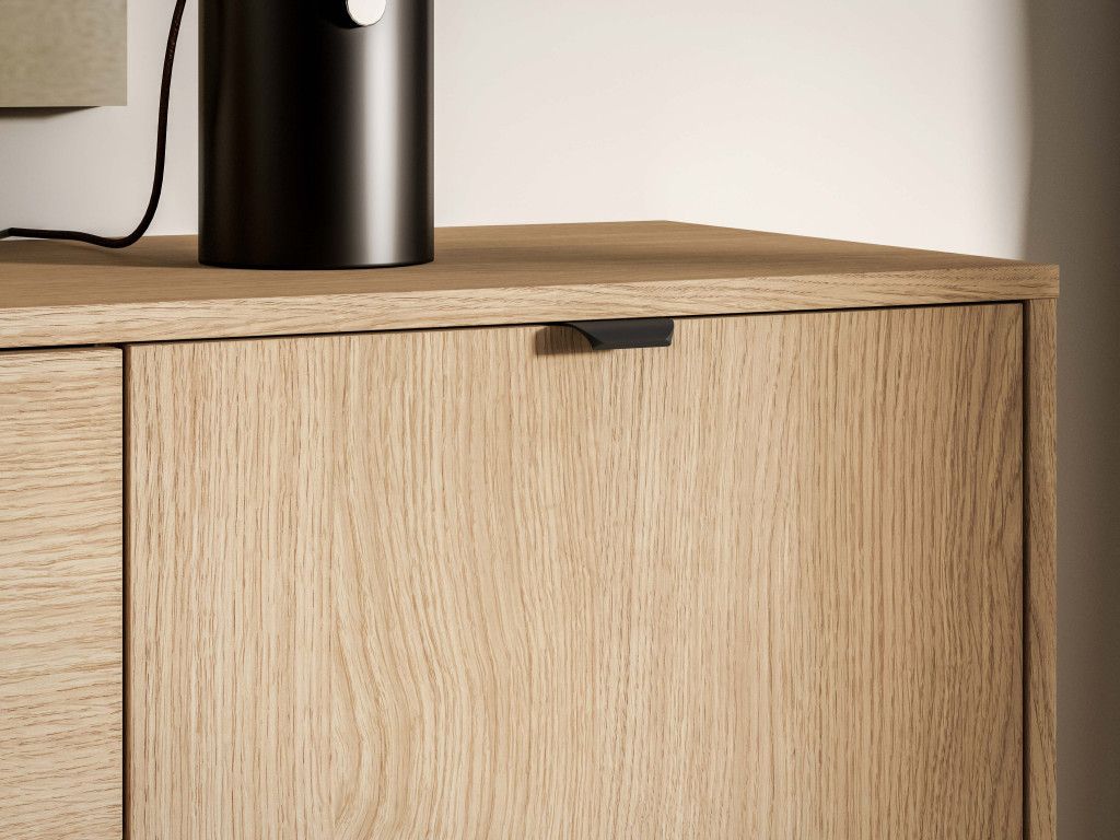 Detail v podobe čiernych hranových úchytiek, plného výsuvu zásuviek a tichého dovierania zaručuje pohodlné a kvalitné používanie. Ideálna voľba do obývačky aj spálne v jednotnom štýle kolekcie Reynos.