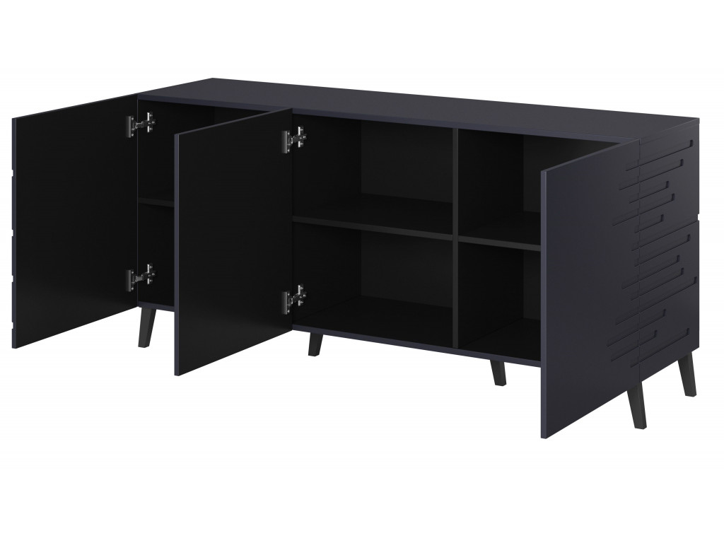 Komoda nepotrebuje žiadne rúčky, nakoľko predné časti siahajú nad vrch a tak sa dvierka dajú pohodlne otvoriť. Na otvorenie slúžia tri dvierka, vo vnútri sa nachádza jedna polica a spolu až 6 úložných priestorov. Nožičky sú z čierneho plastu a ich mierne zakrivenie do strán dodáva komode osobitný dizajn.