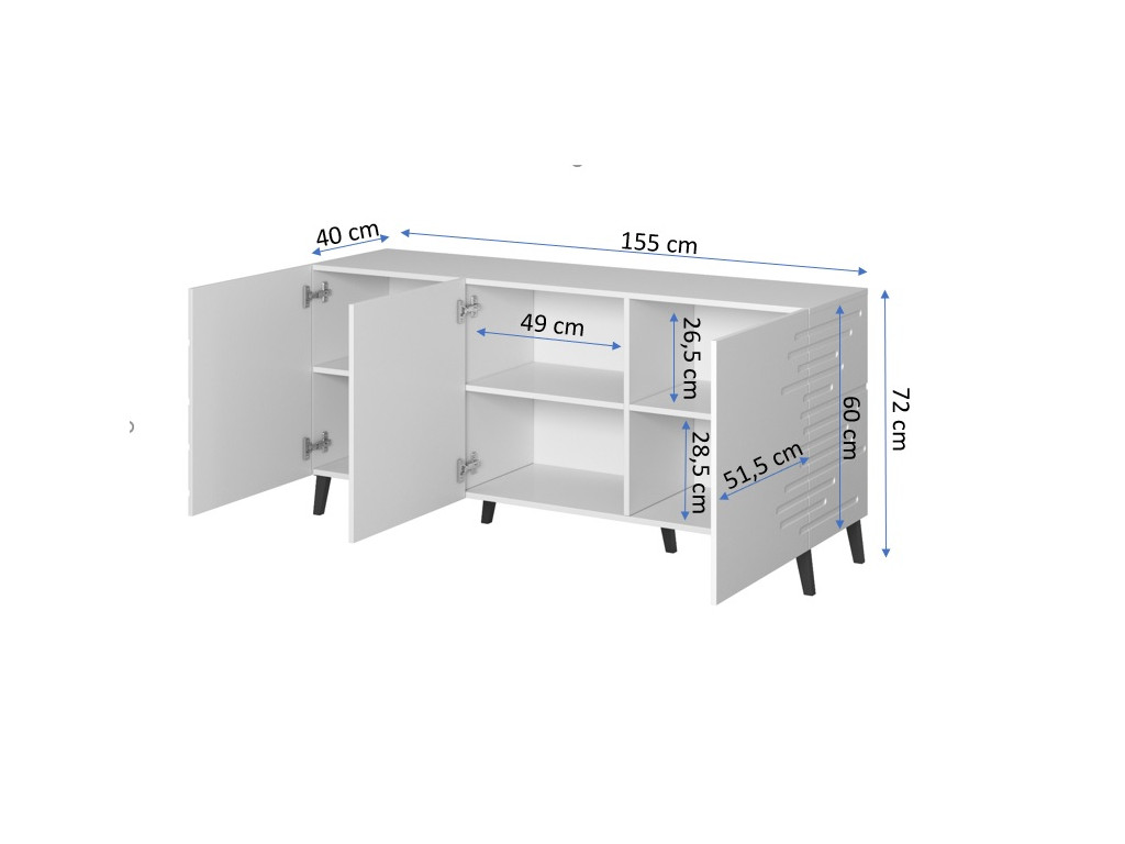 Modrá komoda Nova zapadne do každého moderného interiéru. Je skvelým funkčným a dizajnovým doplnkom do obývačky, chodby alebo predsiene. Komoda stojí na pevných 12 cm nožičkách a na uloženie poskytuje tri skrinky, zakryté tromi dvierkami.