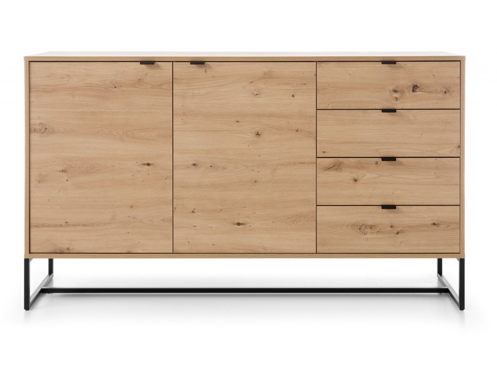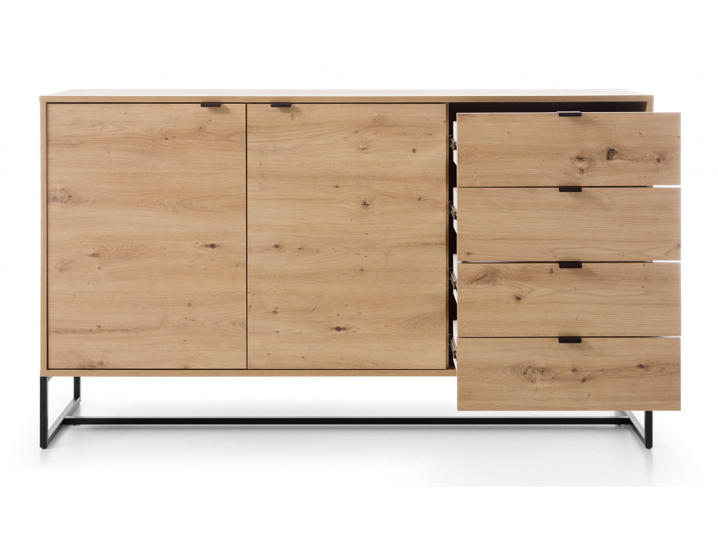 Moderná, praktická a dizajnová. Taká je široká komoda do obývačky Amber. Hrejivý odtieň duba v kombinácií s kovovými prvkami pôsobí loftovým dizajnom. Vďaka čiernemu podstavcu pôsobí nábytok ľahko, no zároveň je veľmi stabilným.
