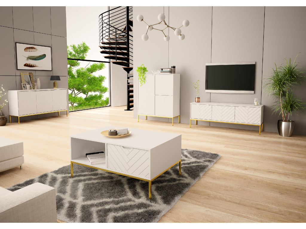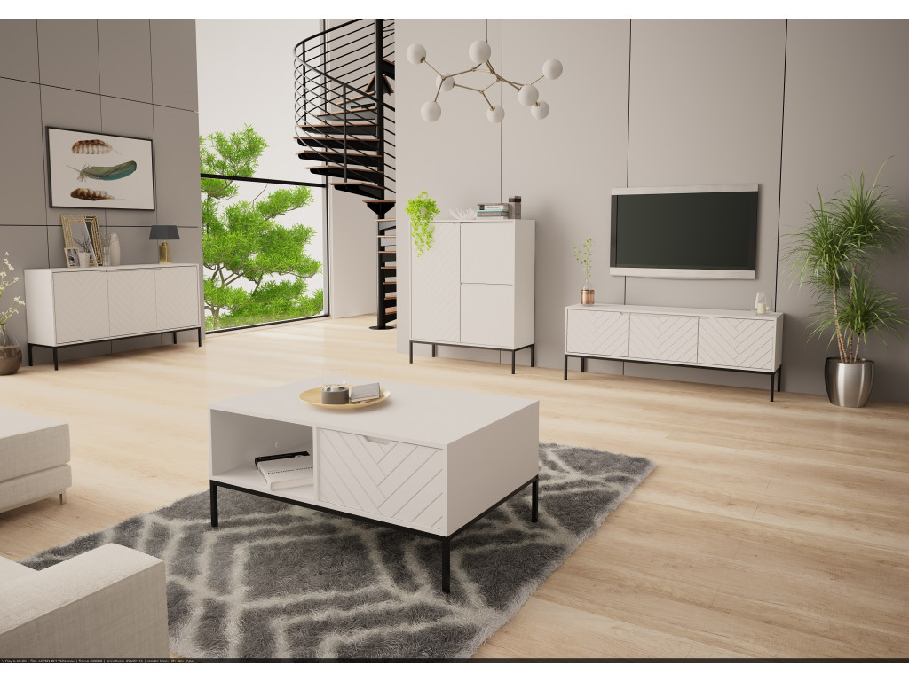 - Matný biely povrch spolu s frézovaným stromčekovým vzorom na čelách pridávajú komode štýlový a moderný vzhľad.