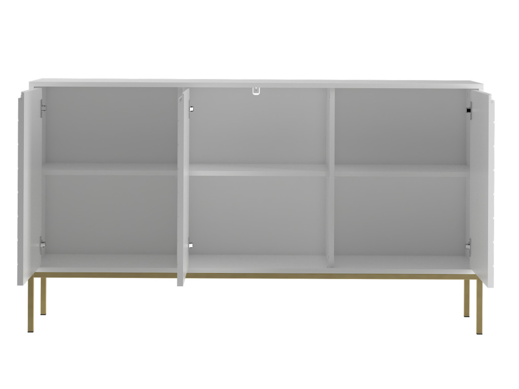 Komoda Aspen 03 v matnej bielej farbe prináša do interiéru čistotu a eleganciu. S čelami s jemným frézovaným stromčekovým vzorom a minimalistickým bezúchytkovým otváraním je dokonalým prvkom pre moderné priestory. Troje otváracie dvierka poskytujú praktický a plnohodnotný úložný priestor, zatiaľ čo jej precízne spracovanie zaručuje dlhú životnosť.
