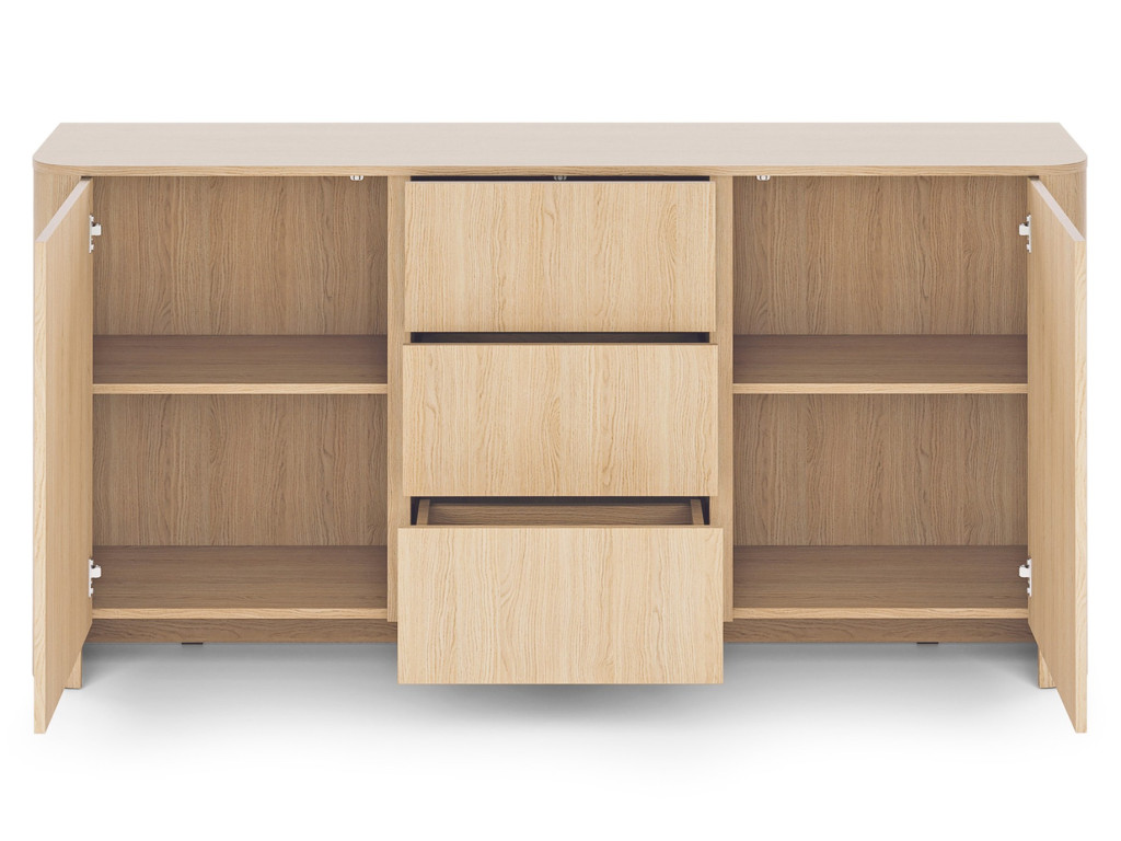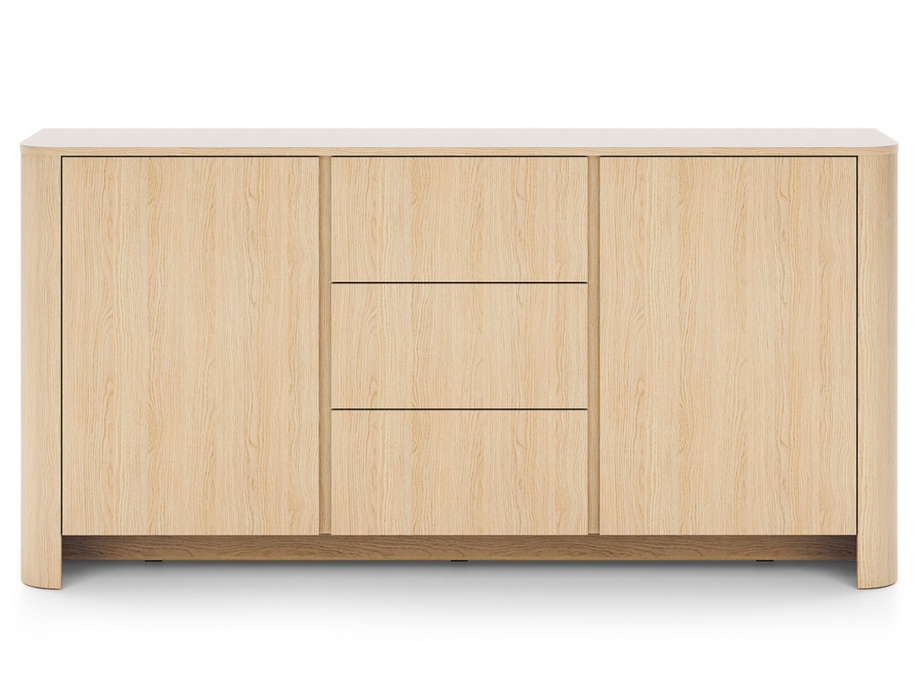 Široká komoda Bari – dub vincenza kombinuje stredové zásuvky a bočné skrinky v nadčasovom dizajne. Elegantné spracovanie s push-to-open systémom a stabilnou soklovou základňou.