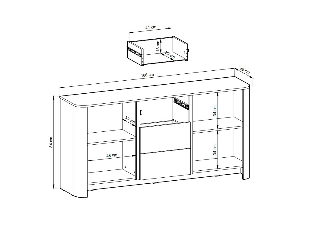 Variant v dekore dub vincenza prináša do interiéru hrejivý a prirodzený nádych. Komoda s rozmermi 168 × 39 × 84 cm ponúka tri zásuvky v strede a dve bočné skrinky s dvierkami, takže spája praktickosť so štýlovým dizajnom. Kvalitné spracovanie z MDF a laminovanej DTD s ABS hranami zaručuje odolnosť a pohodlné používanie aj pri každodennom zaťažení.