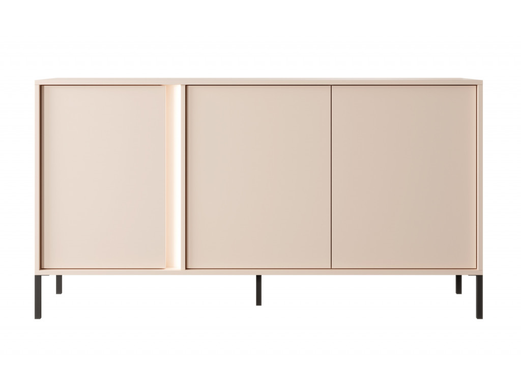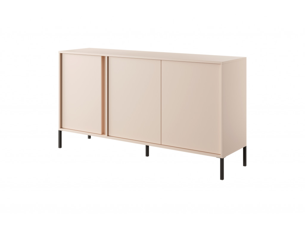Komoda Dast je vyhotovená v jemnej béžovej farbe s matným povrchom. Spolu s čiernymi kovovými nohami tak vytvárajú dokonalý kontrast, ktorý pôsobí elegantne a štýlovo. Tri skrinky s dvierkami ponúkajú úložný priestor rozdelený policami, takže všetky uskladnené veci môžete mať ľahko dostupné a prehľadne uložené.