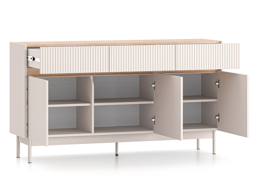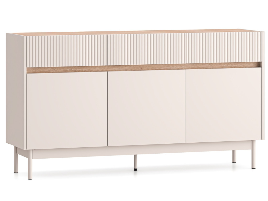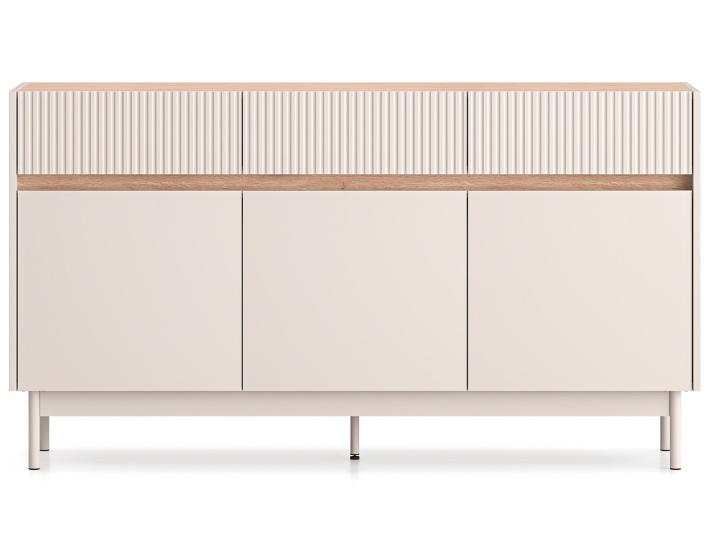 Elegantná komoda Dunea 05 s 3 zásuvkami a 3 dvierkami ponúka veľa priestoru na oblečenie, hračky či doplnky. V nadčasovej kombinácii kašmírovo béžovej a dubu krémového zapadne do modernej obývačky aj detskej izby.