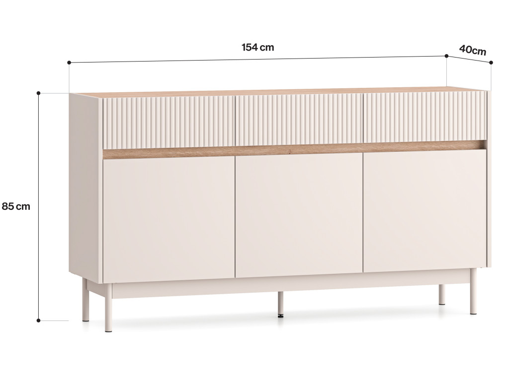 Vďaka rozmerom 154 × 40 × 85 cm (Š × H × V) sa skvelo hodí aj do väčších detských a rodinných interiérov. Jemná kombinácia kašmírovo béžovej farby a dubu krémového pôsobí elegantne, nadčasovo a ľahko zapadne do moderného štýlu bývania.