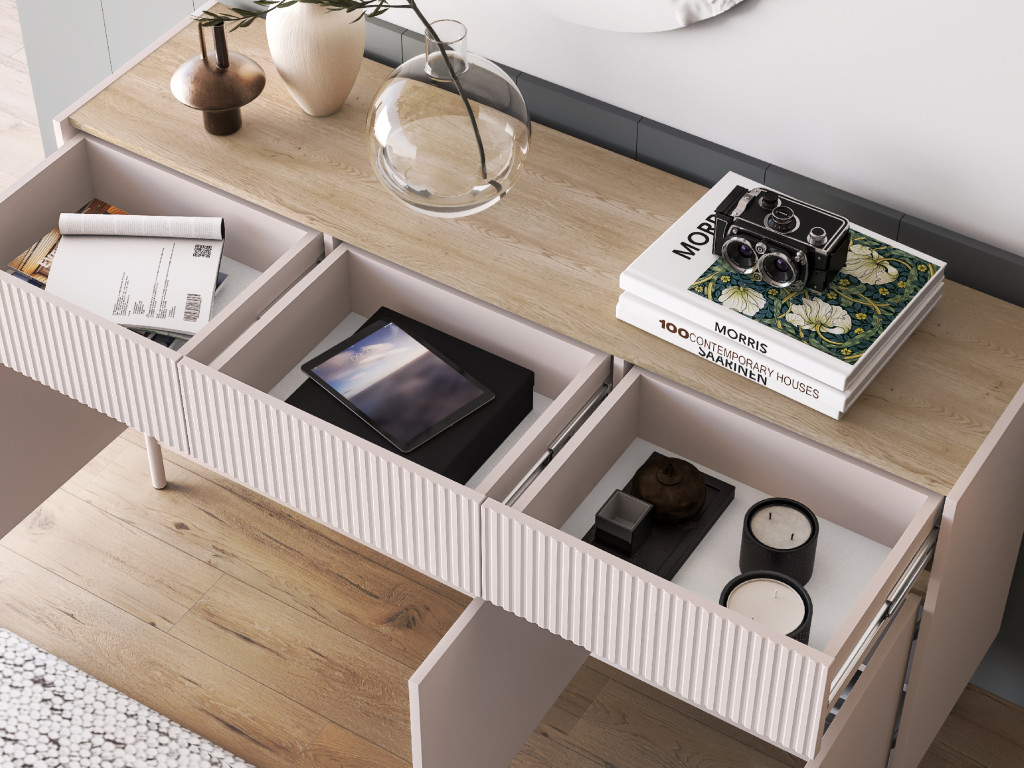 Široká komoda Dunea ponúka ideálne riešenie na prehľadné uloženie oblečenia, doplnkov či hračiek. Je vybavená tromi priestrannými zásuvkami a tromi otváracími dvierkami, vďaka čomu poskytuje dostatok miesta na rôzne typy vecí a pomáha udržiavať izbu vždy upratanú.