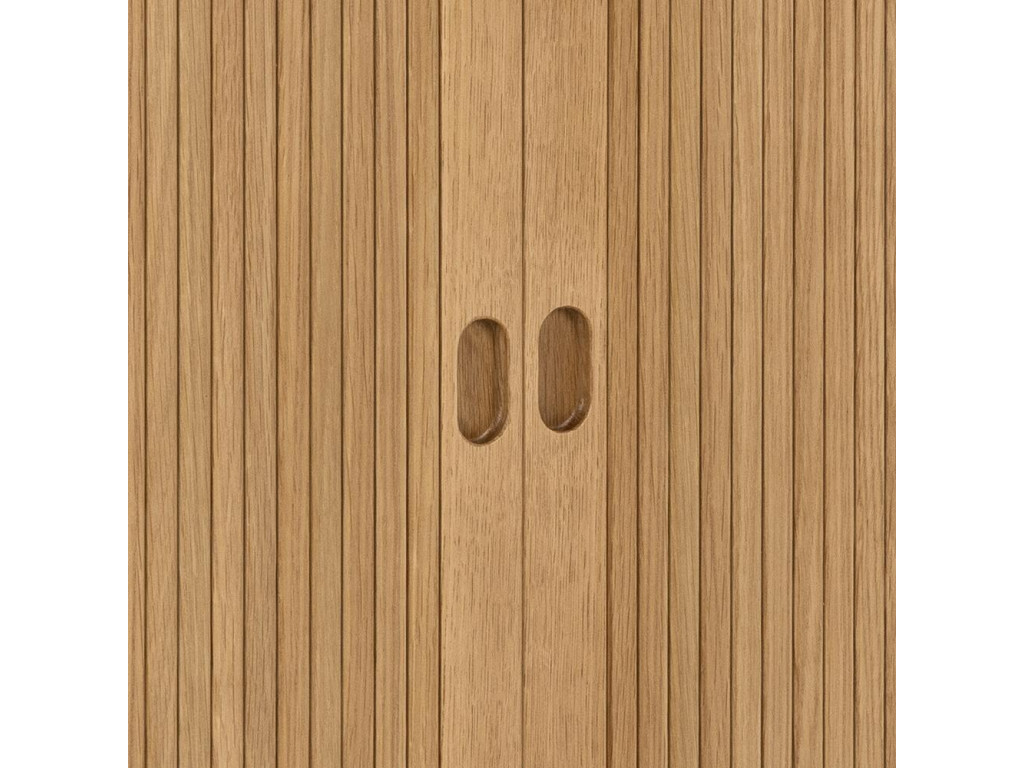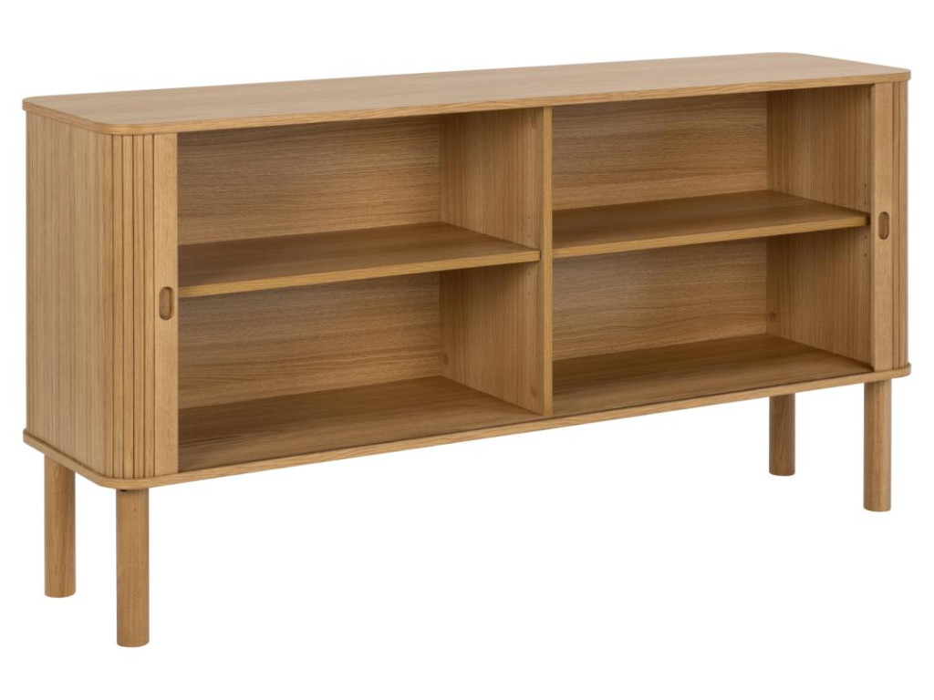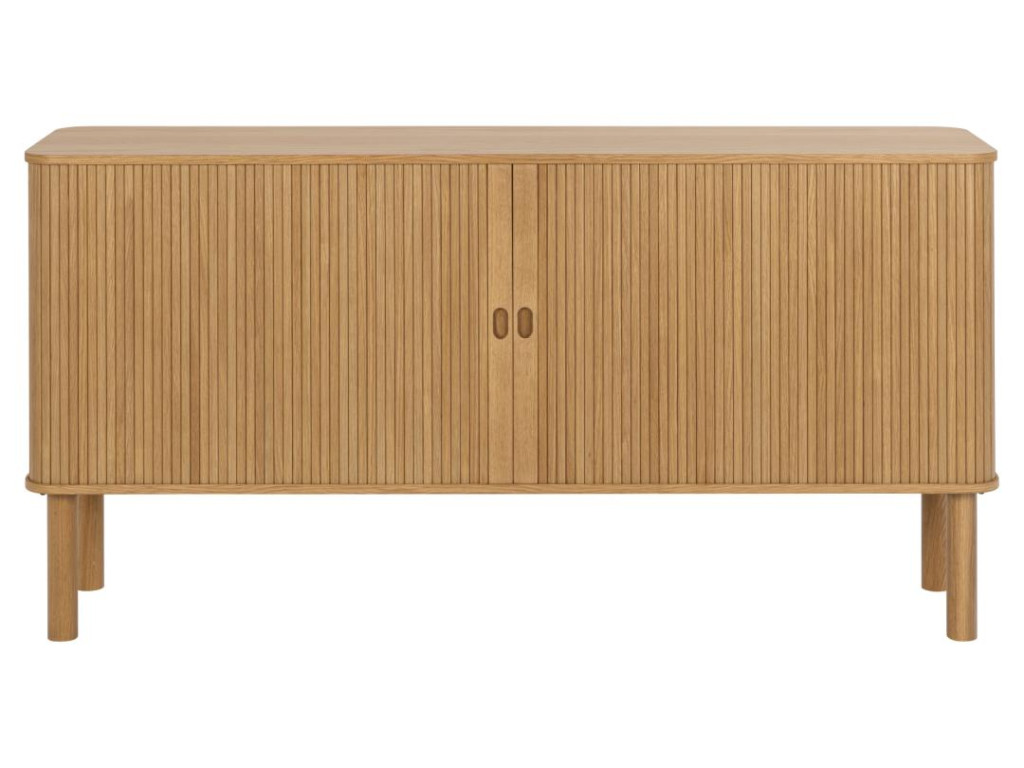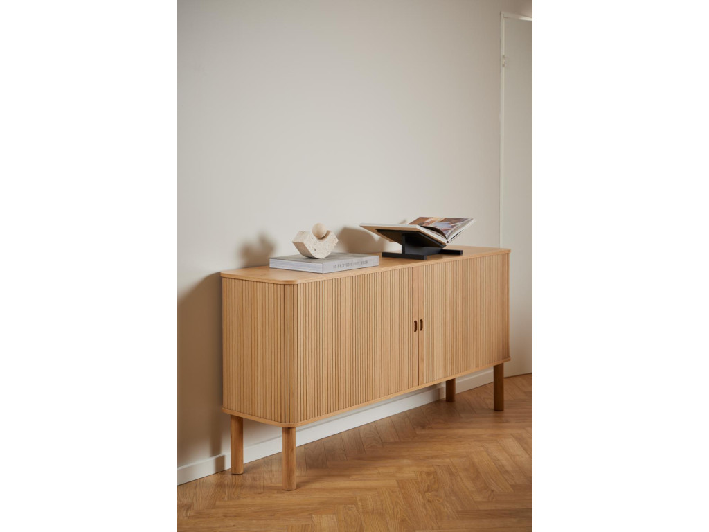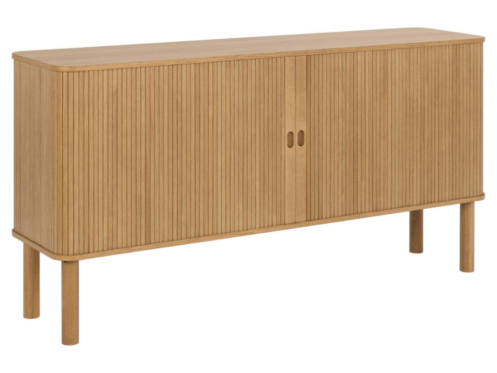Komoda Langley vo svojom širokom prevedení poskytuje dostatok úložného priestoru pre každú domácnosť. Vďaka dubovej dyhe a lamelovým predným častiam pôsobí veľmi elegantne a prírodne. Posuvné dvierka uľahčujú prístup bez nutnosti otvárania smerom von. Skvelý doplnok do modernej aj klasickej obývačky.