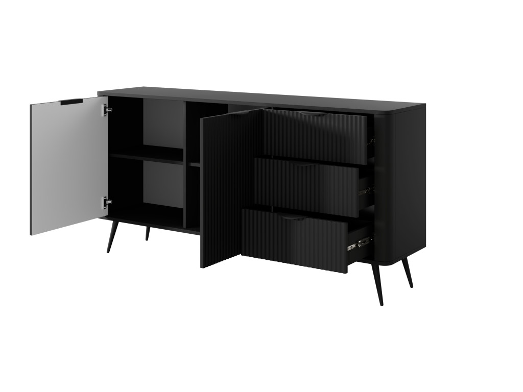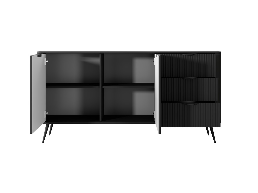 Priestranná komoda disponuje veľkým úložným priestorom. Na pravej strane sa nachádzajú 3 zásuvky, za dvierkami sú 2 police. O elegantnú stránku komody sa postarali vysoké nožičky. Zaujme vás aj farebné prevedenie čiernej farby, ktoré má vrúbkovaný dizajn na čele skriniek a zásuviek. Komoda sa vyznačuje aj absenciou ostrých hrán, čo dodáva nábytku eleganciu a bezpečnosť.